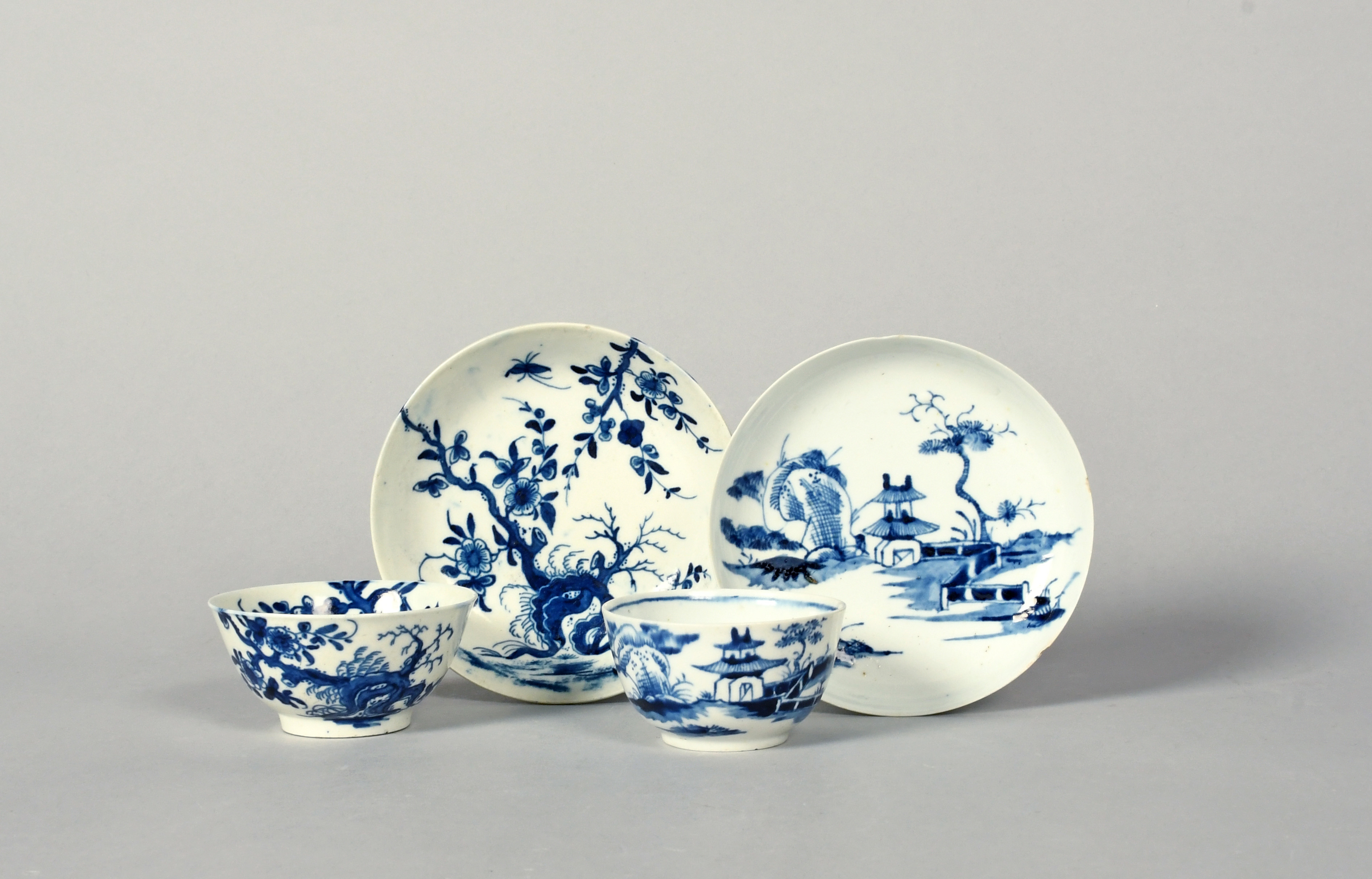 A Longton Hall blue and white teabowl and saucer and a Worcester teabowl and saucer, c.1756-60, the Longton Hall painted with the Gatehouse pattern, the Worcester with the Prunus Root pattern, workman's marks, 12.3cm max. (4)