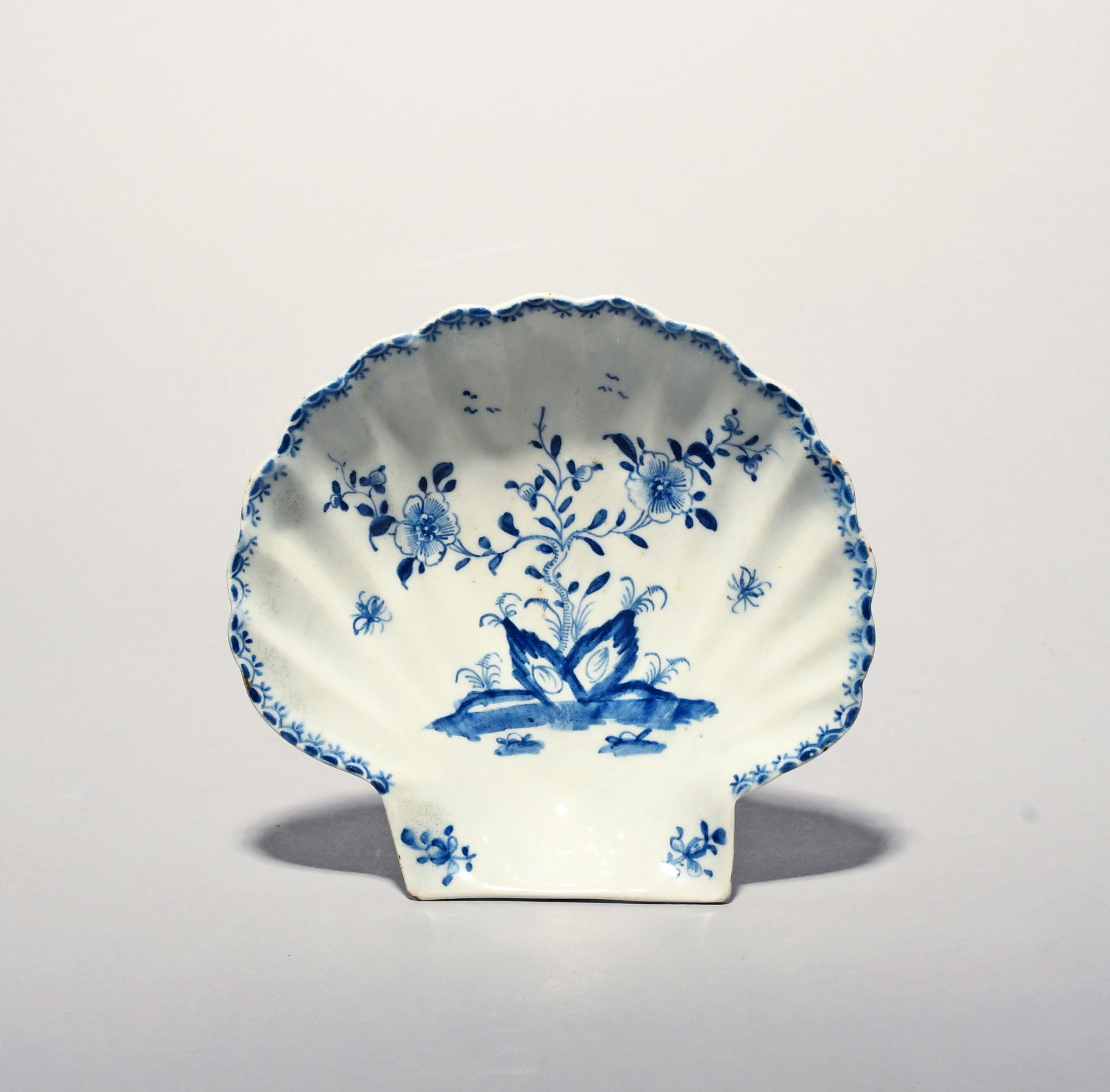 A Lowestoft blue and white pickle dish or salt, c.1765, formed as a large scallop shell, painted with flowering branches issuing from rockwork with flying insects beside, the rim with a berry husk border, a tiny rim chip, 14.5cm.