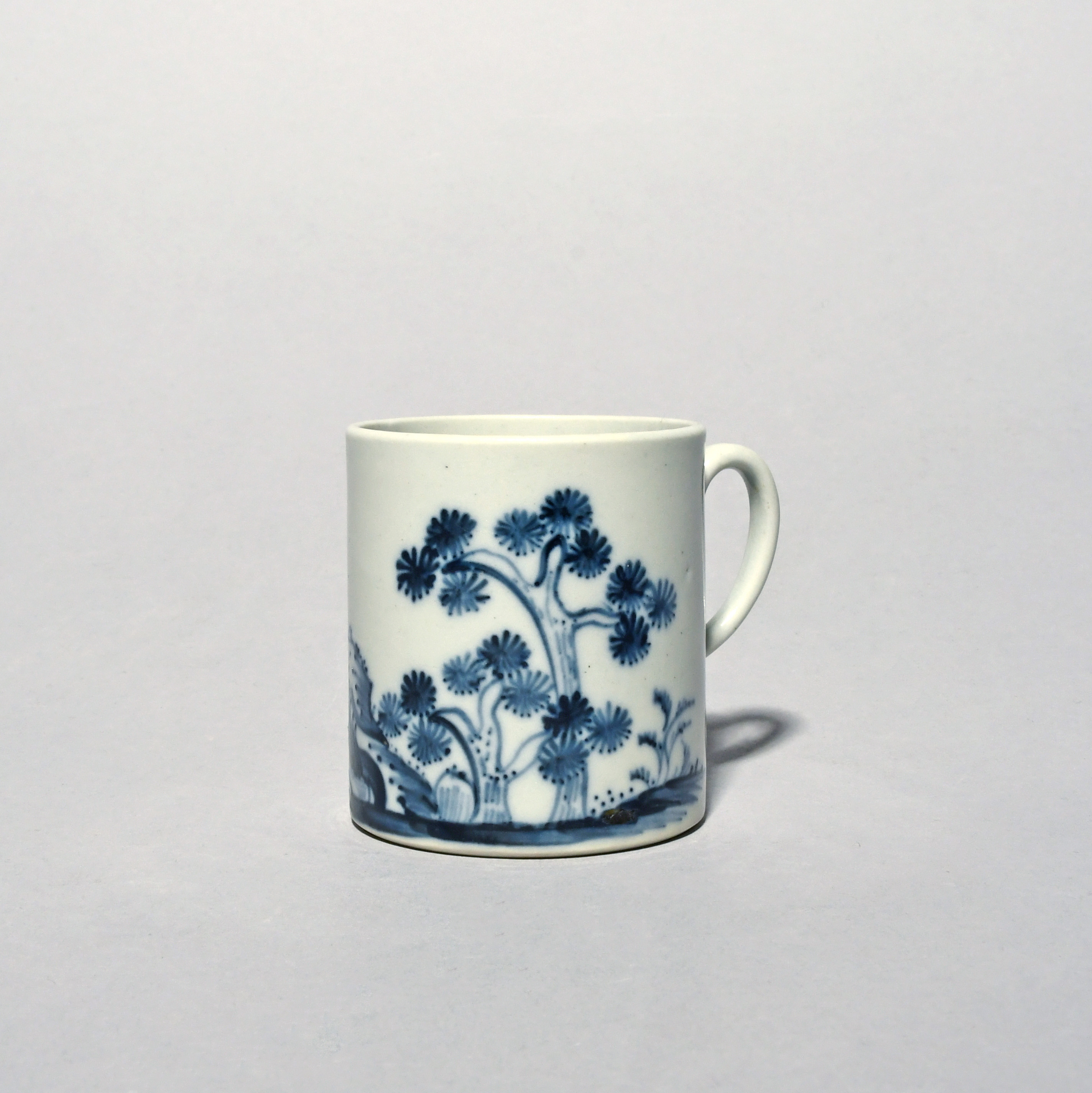 A William Reid (Liverpool) blue and white coffee can or small mug, c.1756-60, the cylindrical form painted with the Fir Tree and Rock pattern, a gnarled pine above rockwork, the reverse with round rocks before an island, painter's mark to the foot, 6.5cm.