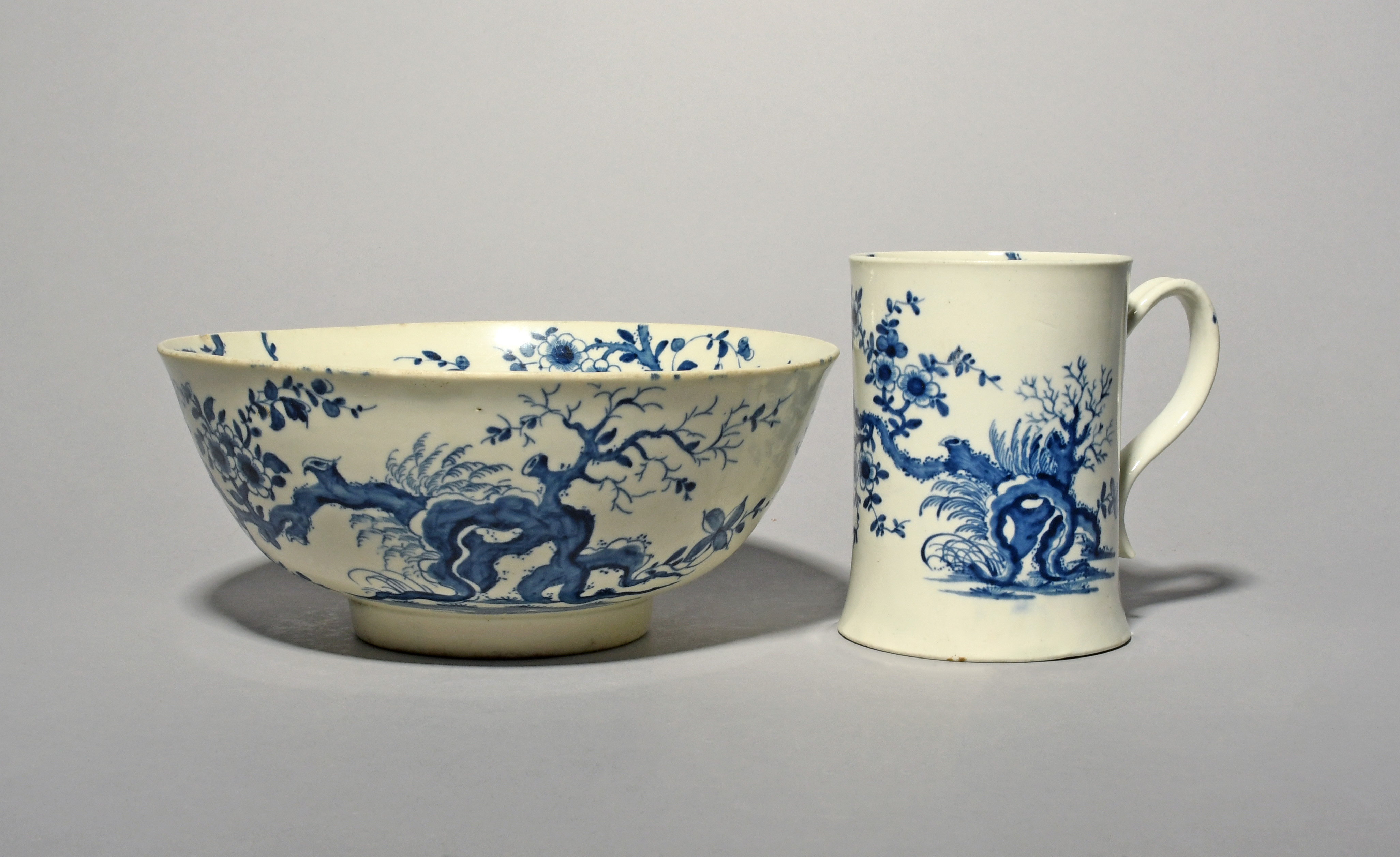 A Worcester blue and white mug c.1755, of cylindrical form with a slightly flared foot, painted with the Prunus Root pattern, workman's mark and short scratch mark, and a Worcester punch bowl decorated in the same pattern, workman's mark, a small rim chip to the bowl, 22.1cm max. (2)