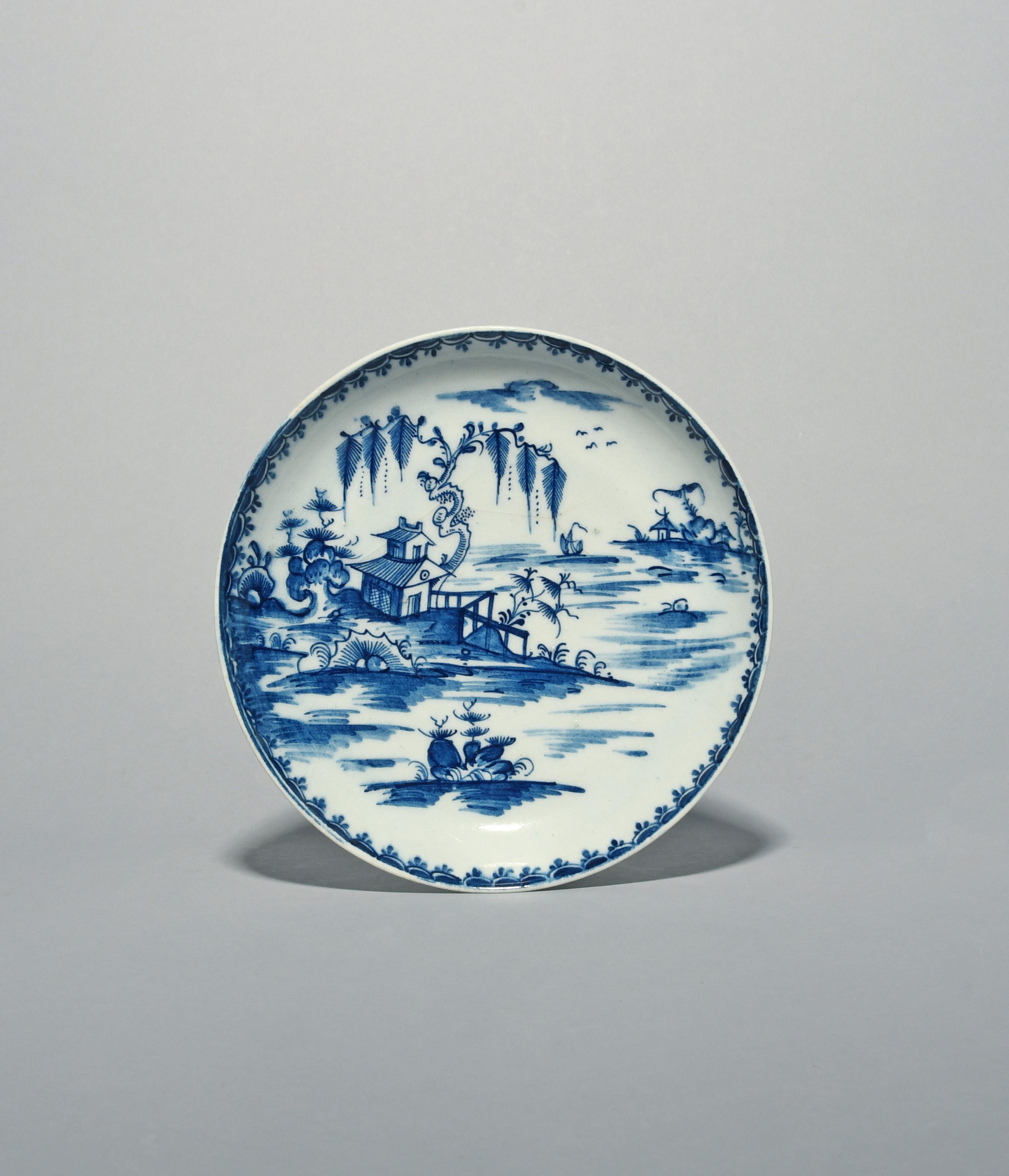A Lowestoft blue and white saucer dish, c.1765-68, painted with a pagoda beneath a gnarled willow tree on an island, the rim with a characteristic berry border, a 10cm crack to the well, 18.6cm.