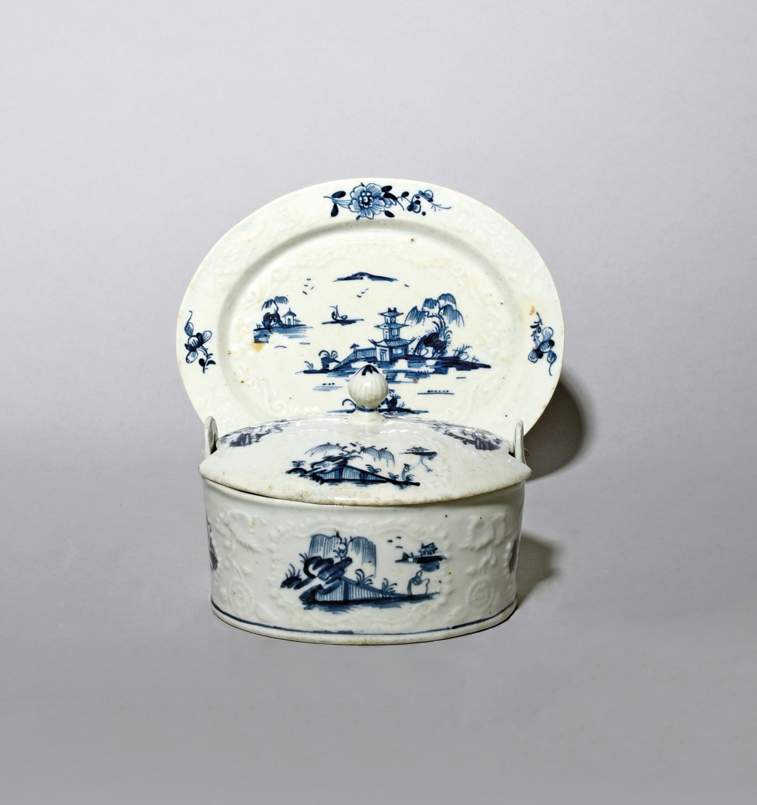 A rare Lowestoft blue and white butter tub with cover and stand, c.1762, with Hughes type moulding, the straight-sided oval tub painted possibly by Richard Phillips, with Oriental landscape panels, echoed to the cover, the stand with a more extensive pagoda landscape, painter's numeral 4 to the tub's footrim, 18cm. (3)