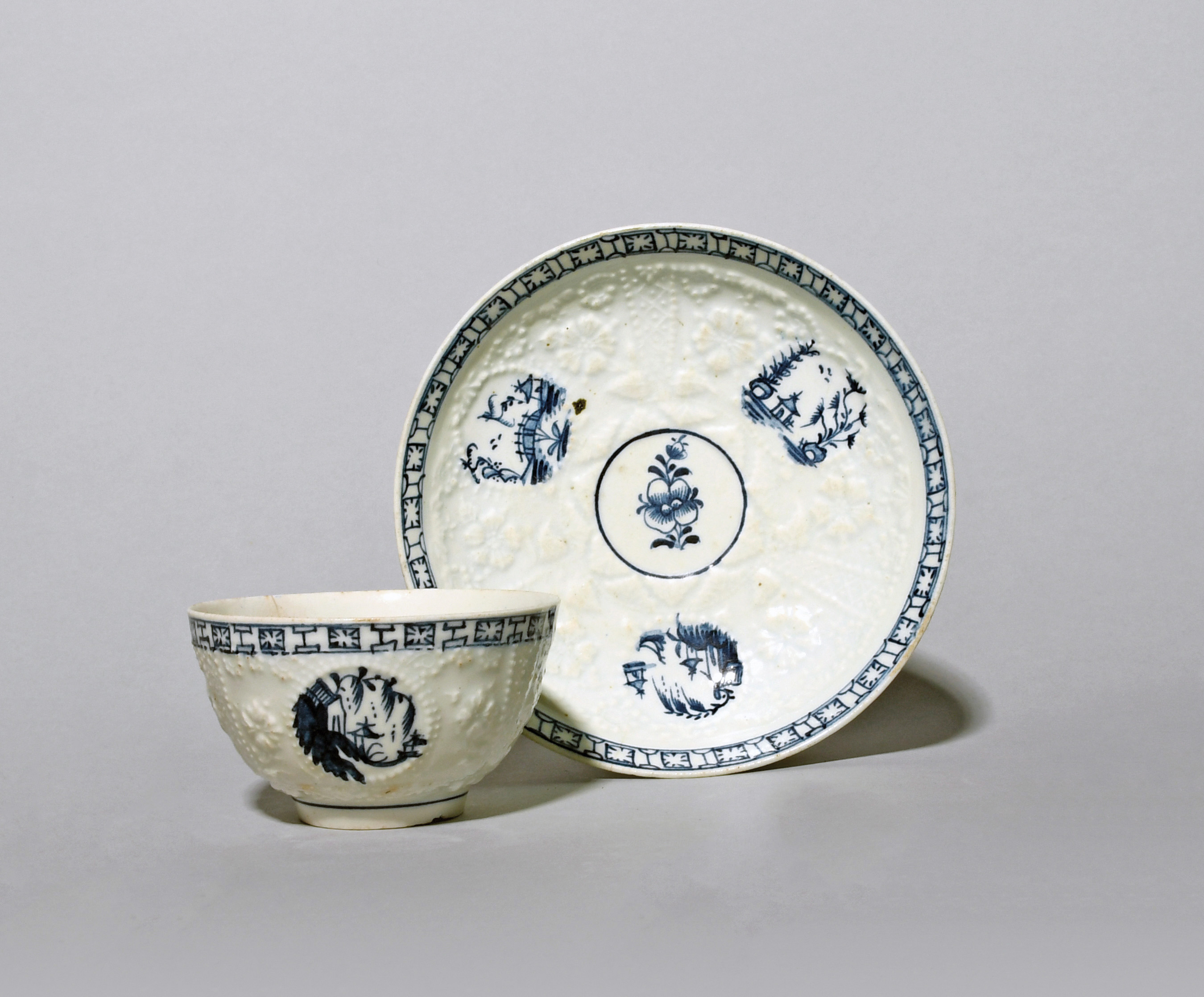 A Lowestoft blue and white teabowl and saucer, c.1761-65, of Hughes type, moulded with small circular panels containing landscape scenes, on a moulded ground of sunflowers and trellis panels, within a cell diaper border, painter's numeral 8 to the teabowl's footrim, 12.6cm. (2)