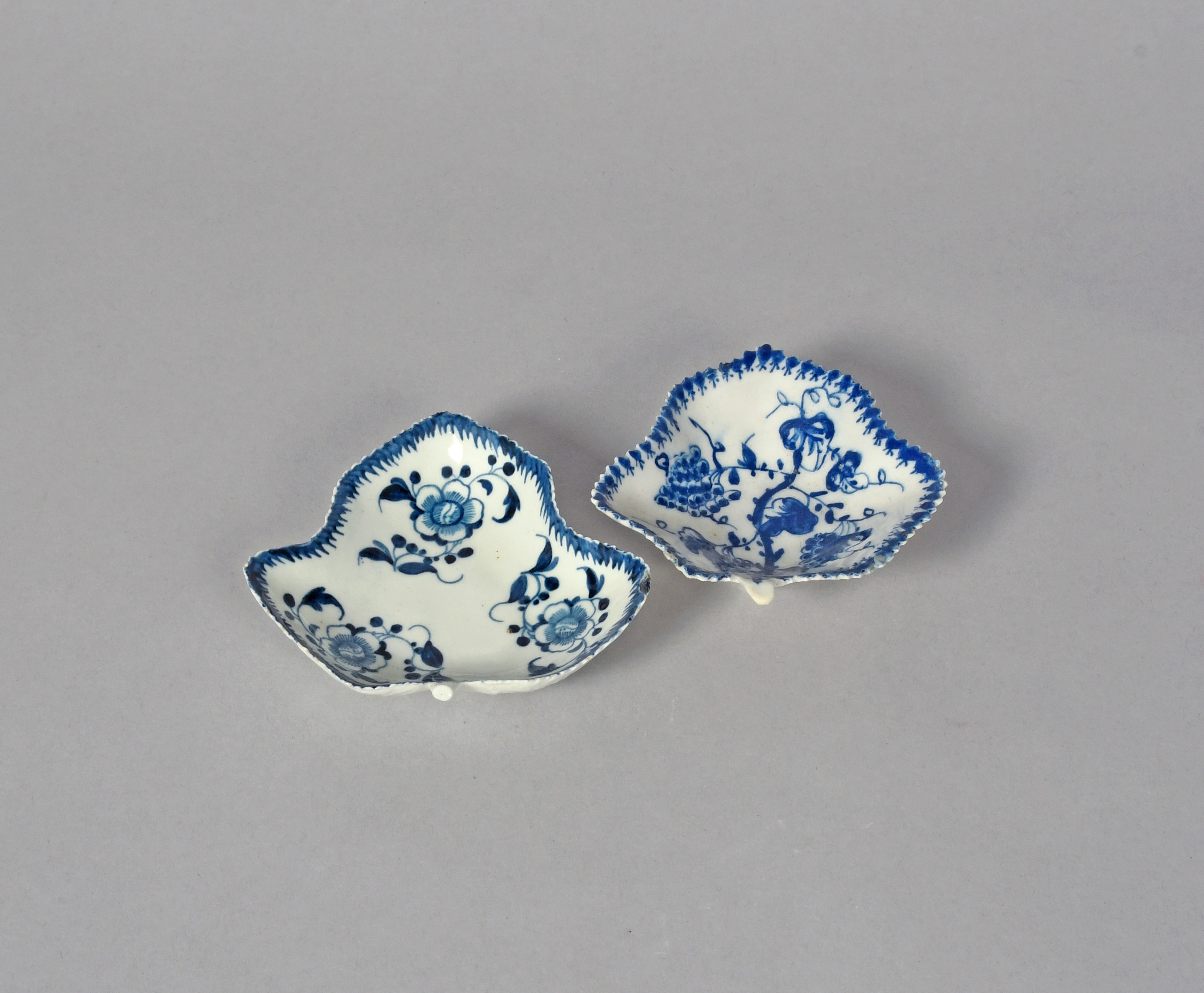 A Lowestoft blue and white pickle dish, c.1762-65, of leaf shape and painted with fruiting grapevine within a berry border, and a Liverpool pickle dish painted with three stylized flower sprays, a chip to the latter, 10.5cm max. (2)