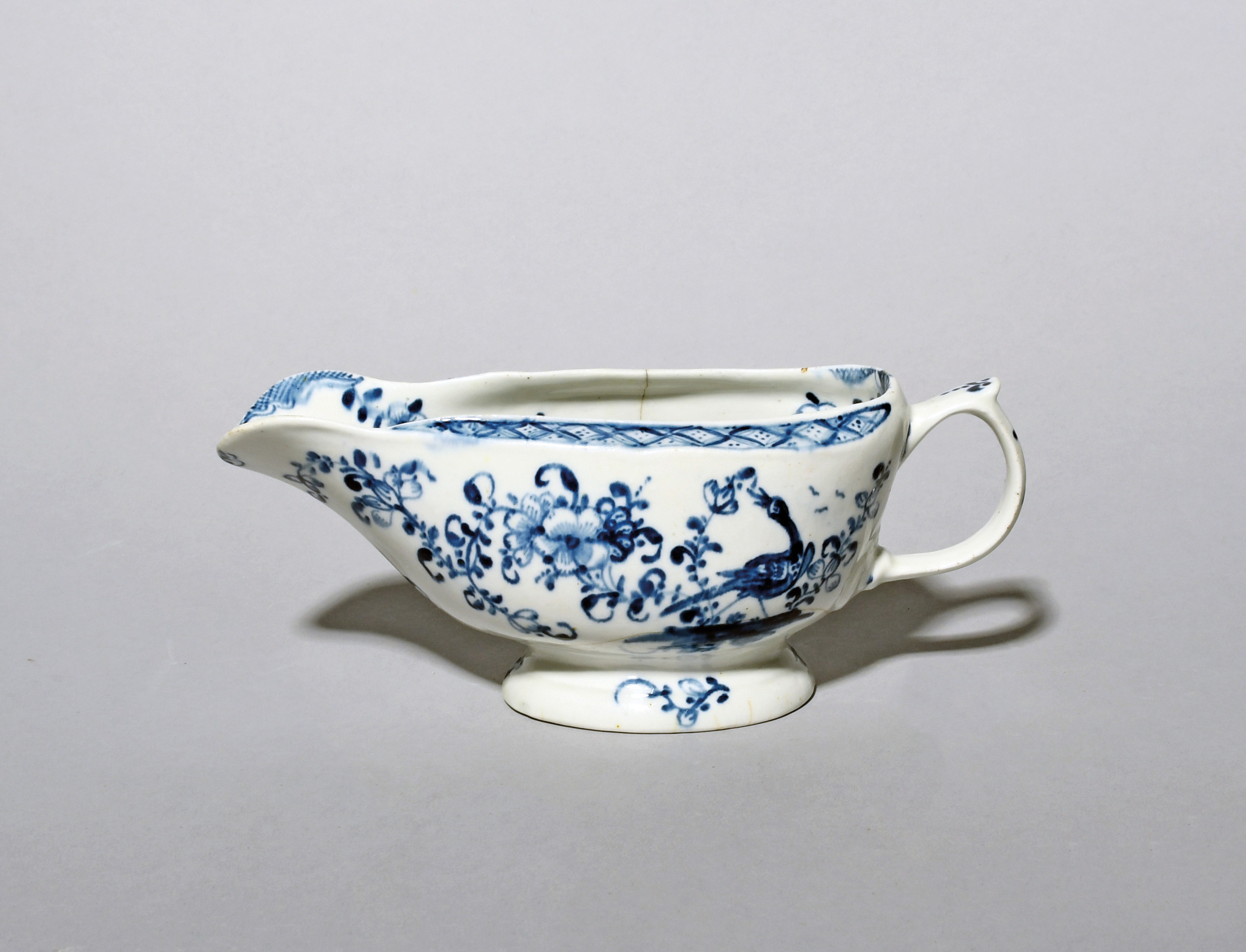 A rare Lowestoft blue and white sauceboat, c.1764-66, of narrow shape, painted probably by Robert Allen with long-tailed birds among flowering Oriental branches, the rim with a trellis band, painter's numeral 5, cracked, 19cm.