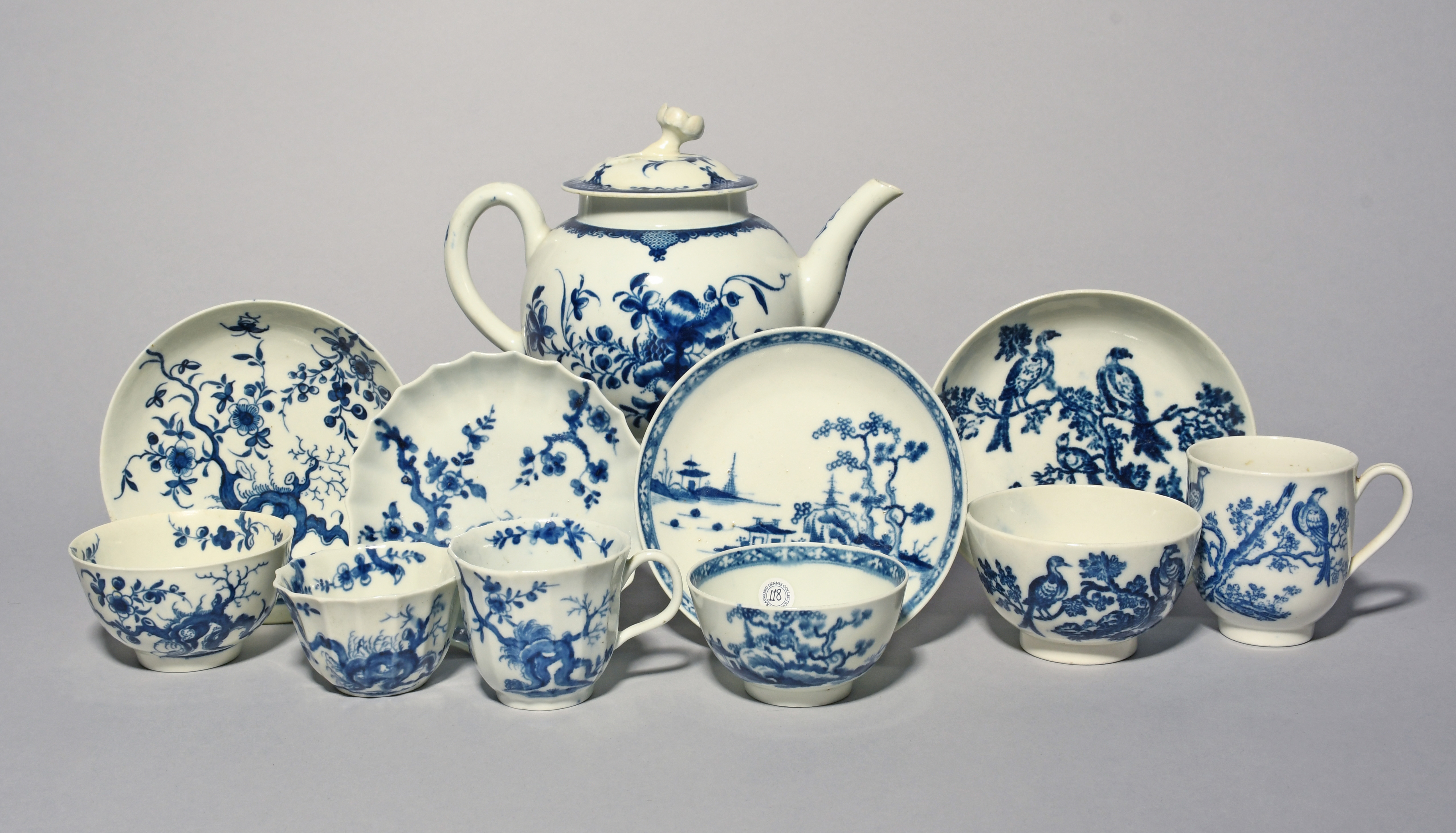 A group of Worcester blue and white teawares, c.1758-70, including a teapot and cover painted with the Mansfield pattern, a fluted trio and a teabowl and saucer in the Prunus Root pattern, and a teabowl and saucer in the Cannonball pattern, together with a Caughley trio in the Birds in Branches pattern, 18.5cm max. (12)