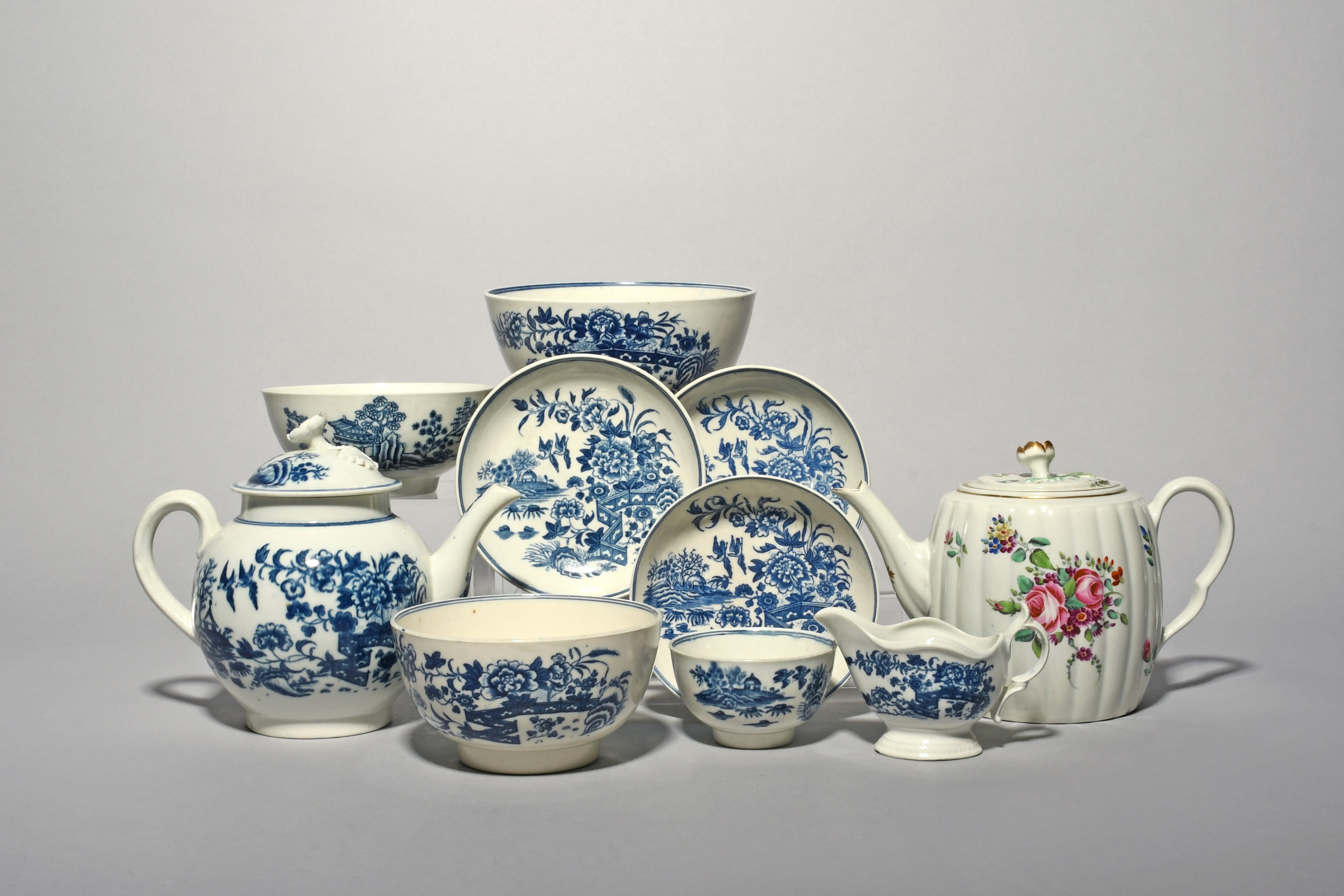 A collection of English blue and white porcelain, c.1760-80, including a Caughley teapot and cover in the Fence pattern, three Worcester and Caughley bowls in the Fence and other patterns, three Worcester saucers and a teabowl in the Fence pattern, a Caughley creamboat with the same decoration, and a Worcester polychrome teapot and cover with floral decoration, minor faults, 19.6cm max. (12)