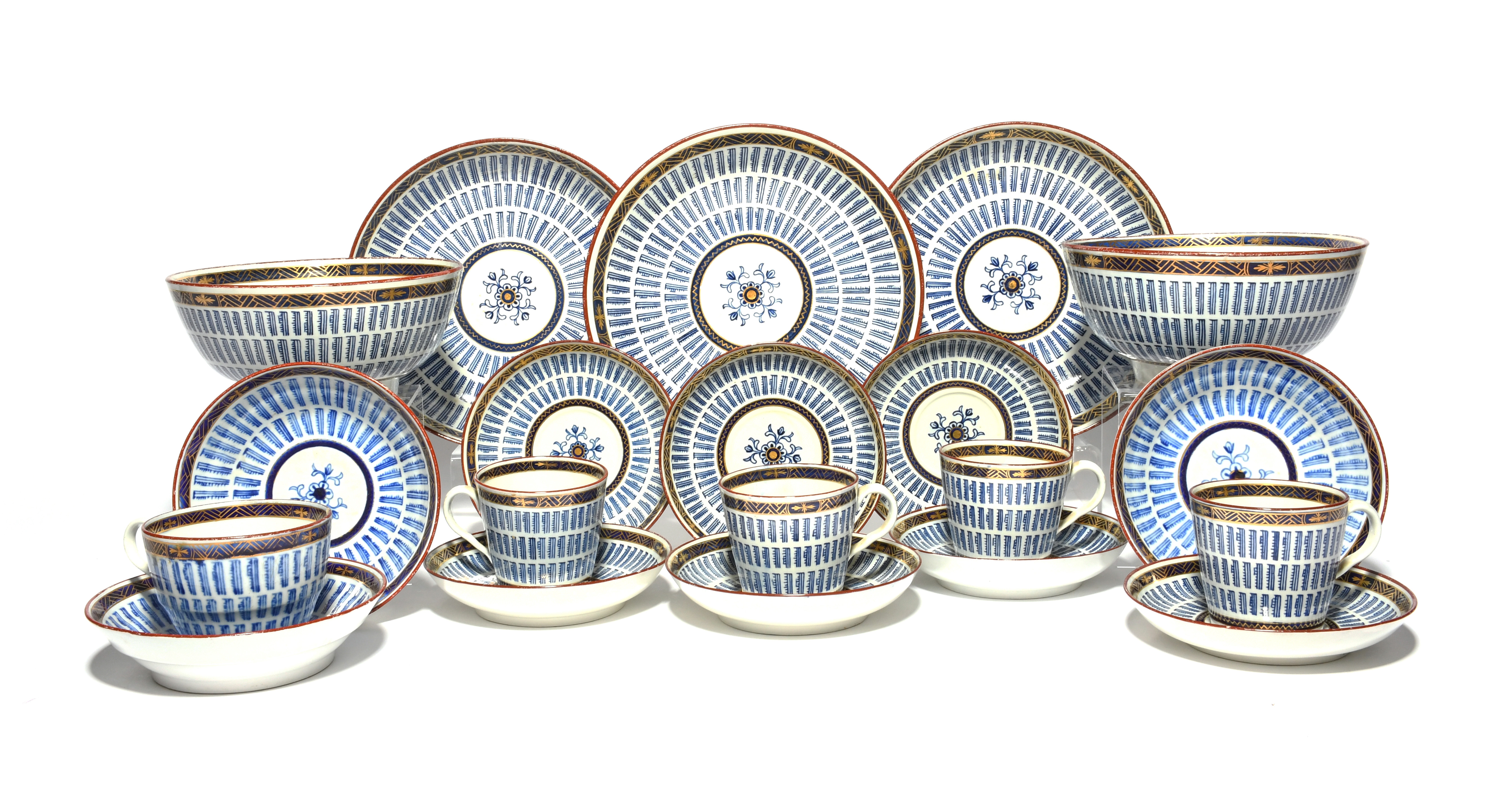 A Worcester part tea service, c.1790-1800, decorated in the Music pattern with radiating bands in underglaze blue between gilt panelled designs on a darker blue ground. Comprising: two slop bowls, three plates, four coffee cups, a teacup and ten saucers. (20)