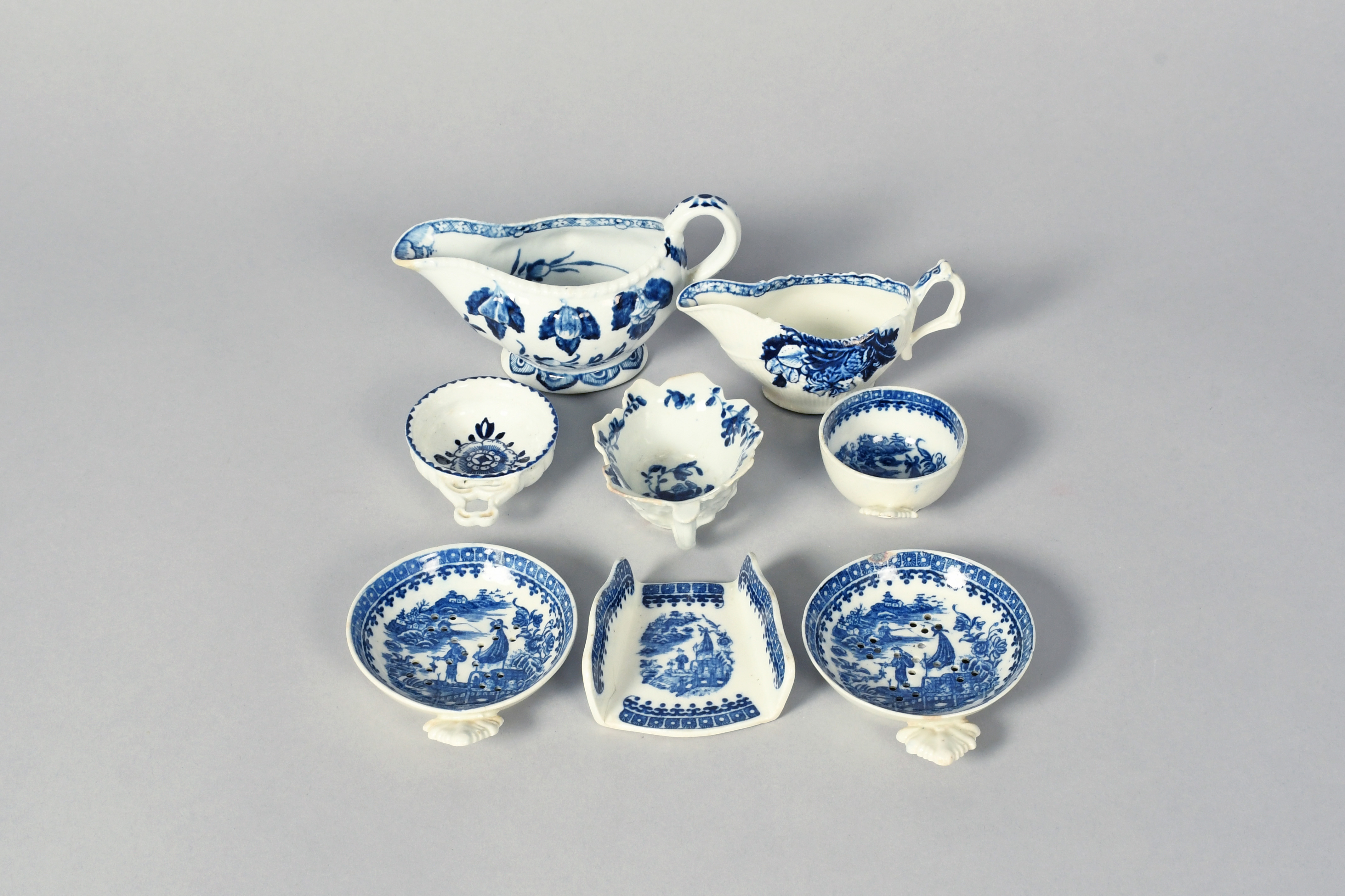 Four Caughley blue and white items in the Fisherman pattern, c.1770-90, including a wine taster, two strainers and an asparagus server, a Worcester geranium leaf butterboat, a Derby wine taster, and two Derby creamboats moulded with fruit, small faults, 14cm max. (8)