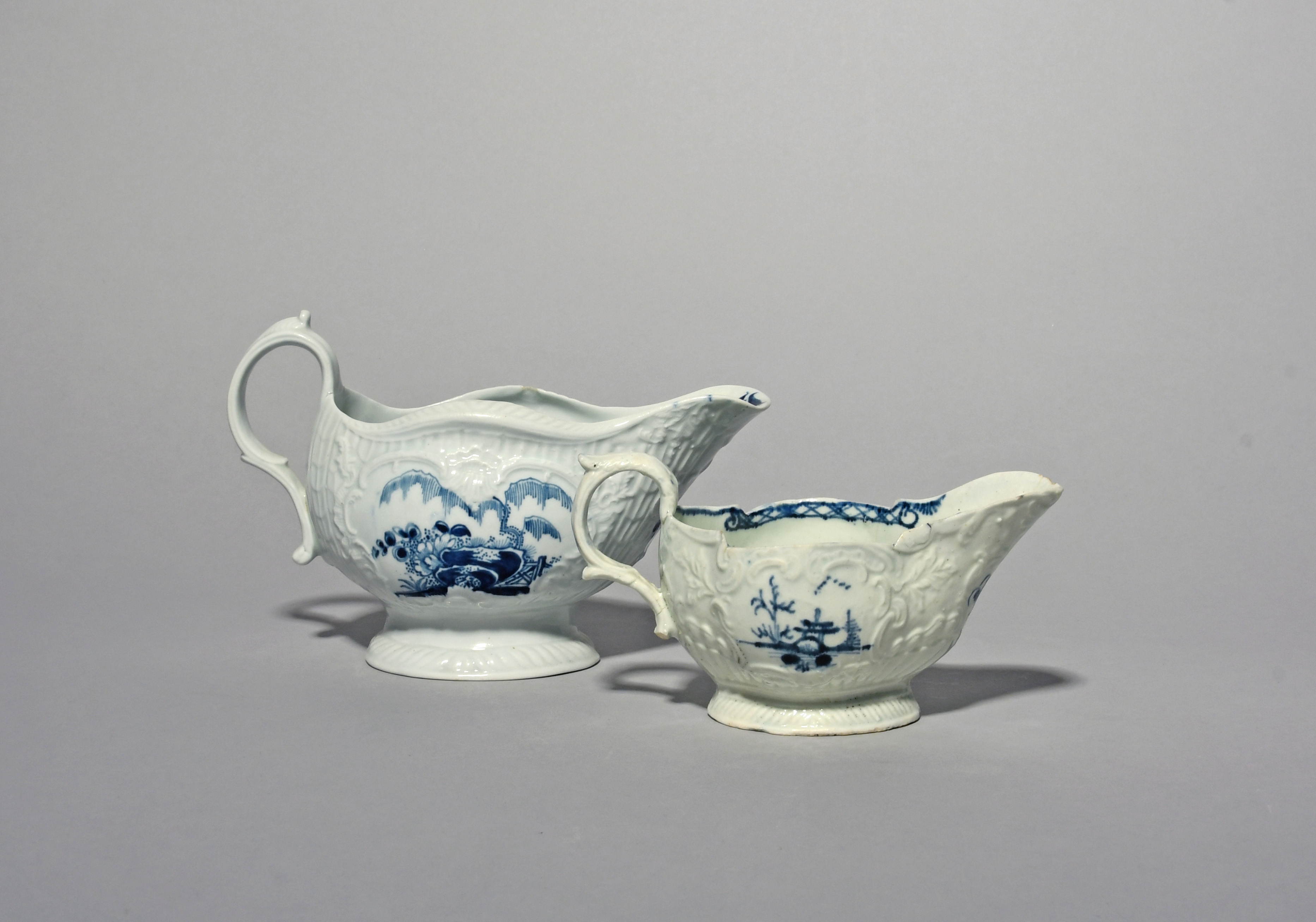 Two Liverpool blue and white sauceboats, c.1765-75, the larger Philip Christian and painted with willow trees over flowering plants within strap-moulded borders, the other Pennington's and painted with panels of low huts and cannon ball rocks, small flaws to the latter, 18.3cm max. (2)