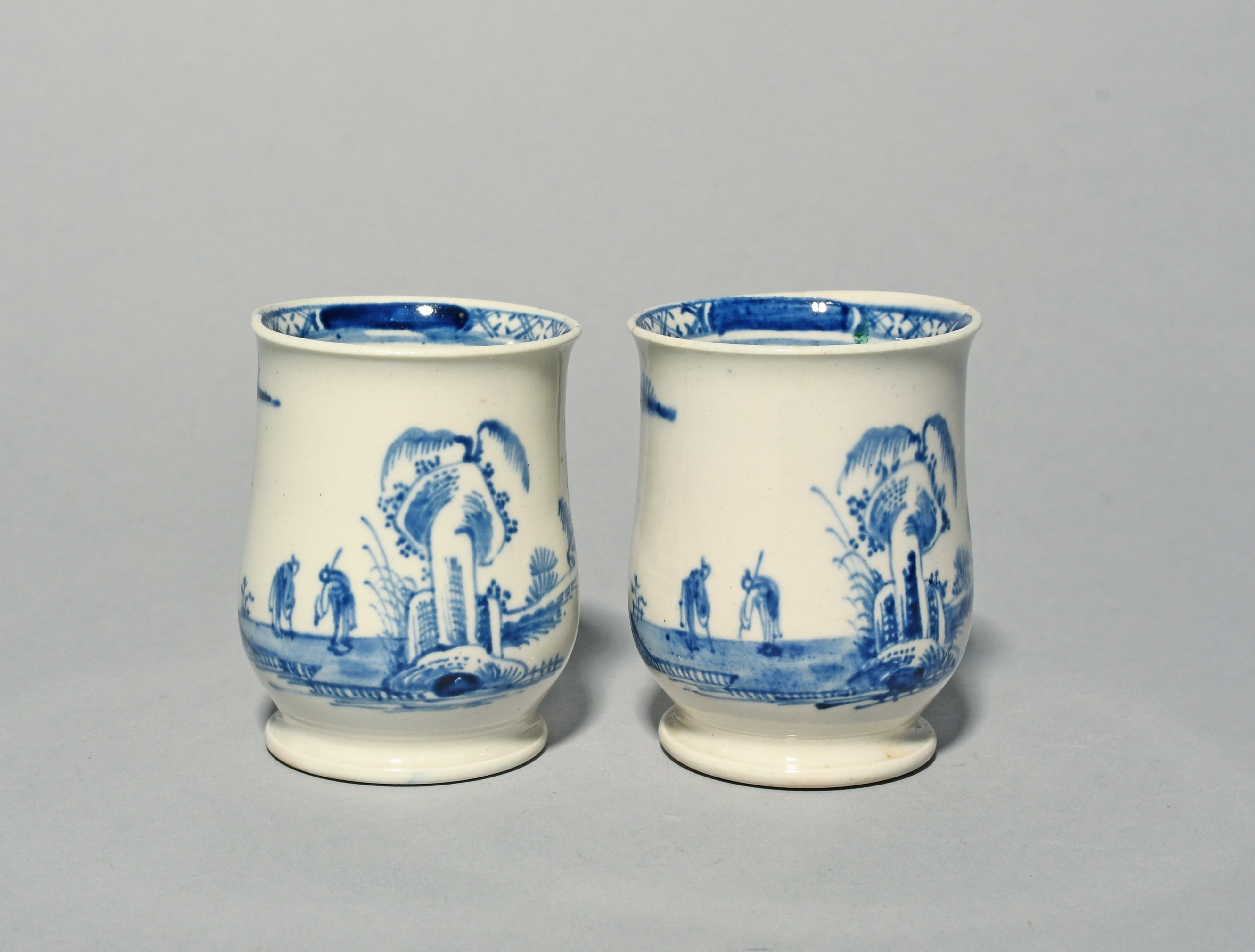 A pair of Vauxhall blue and white coffee cups, c.1756-60, of waisted capuchine shape, painted with two Chinese figures greeting each other beneath tall rocks and fringed trees, the interior rims with a panelled border, small damages, 6.5cm. (2)
