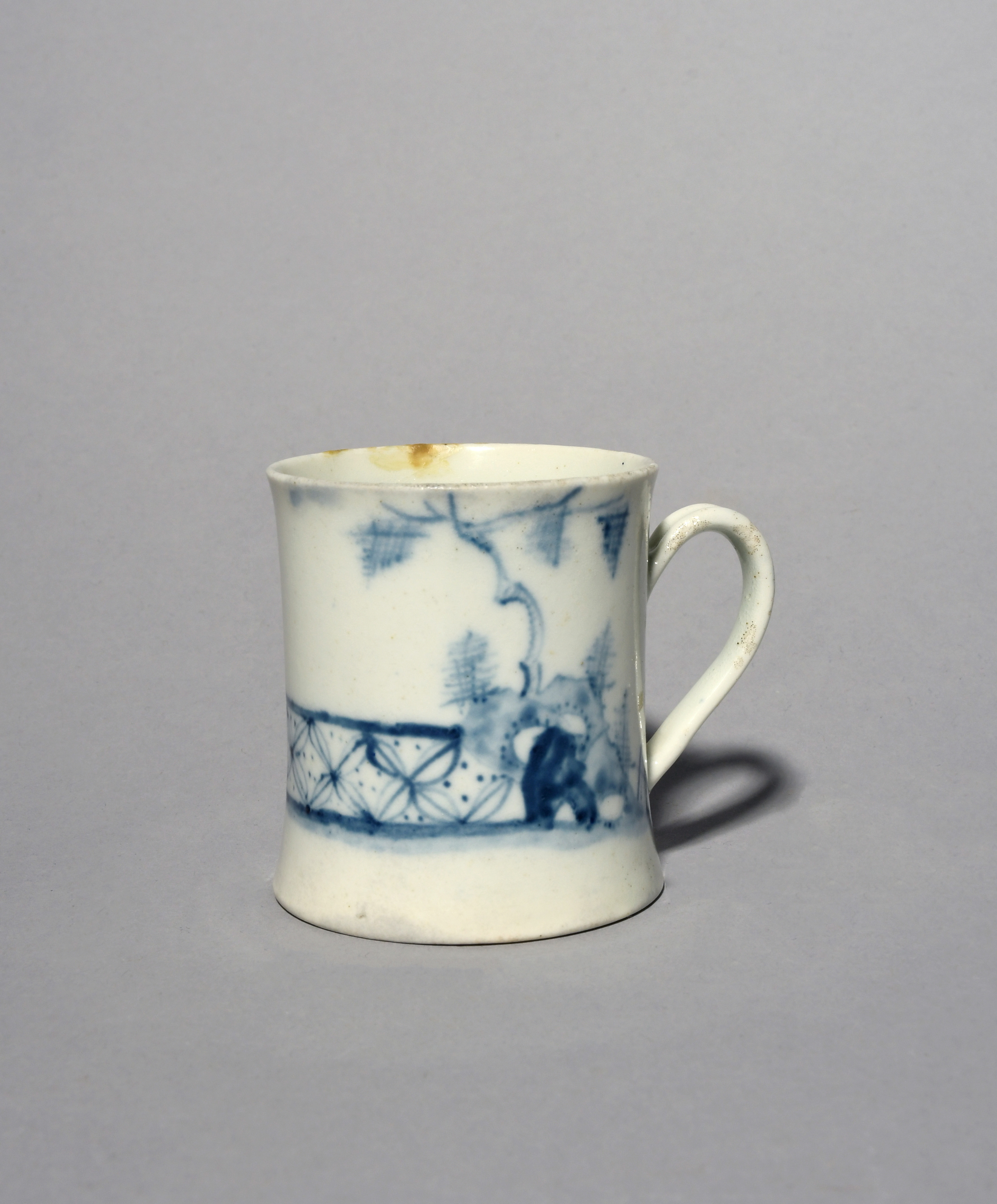 An early Worcester blue and white mug or coffee can, c.1751-53, the slightly waisted form painted with the Willow Root pattern, one side with a figure in a sampan before a small island, the other with a gnarled willow beside an ornamental fence, painter's numeral 4, filled rim chips, 6.4cm.