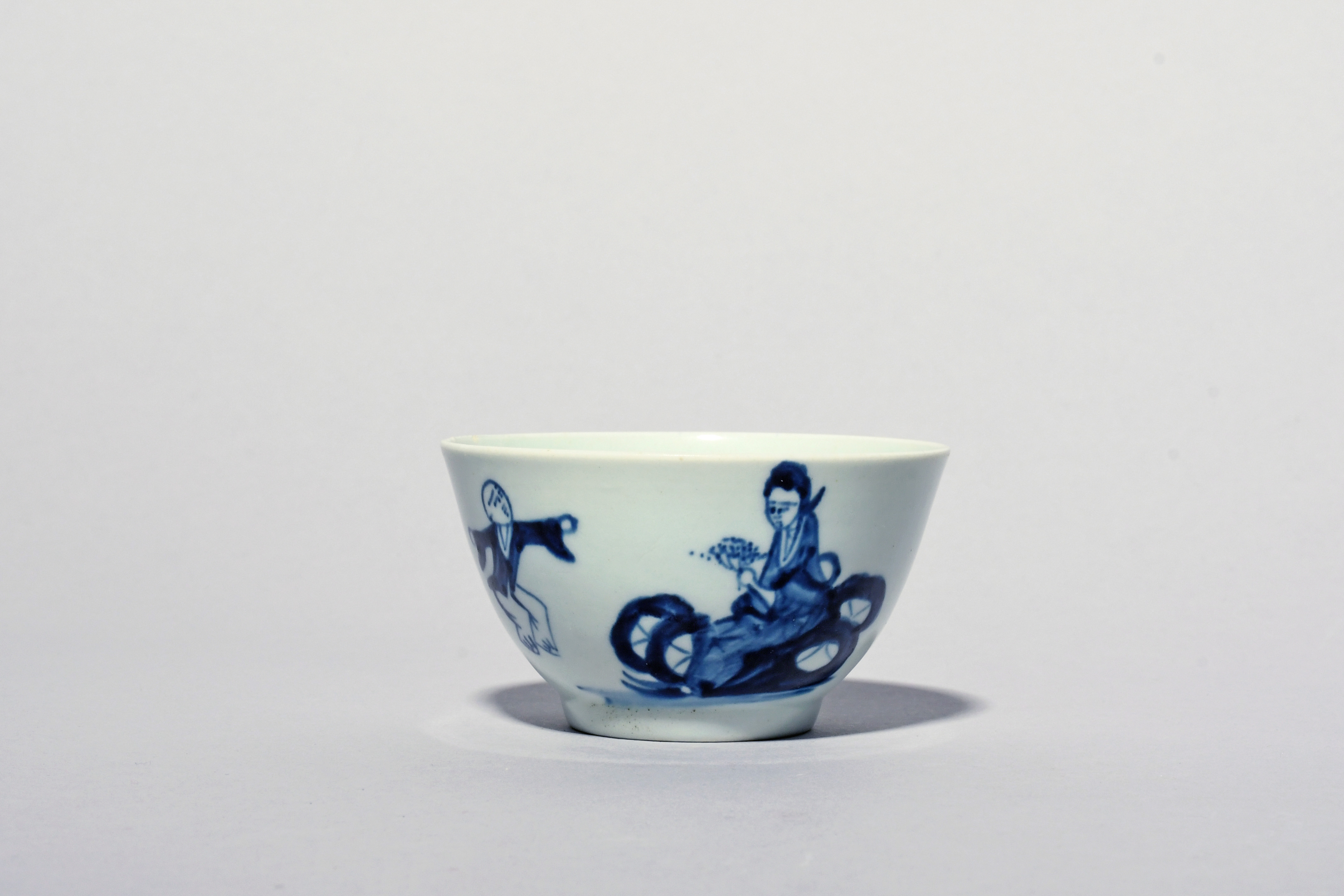 A Richard Chaffers (Liverpool) blue and white teabowl, c.1758-60, painted with the Jumping Boy pattern of an exuberant youngster beside a seated maiden, 7.5cm dia.