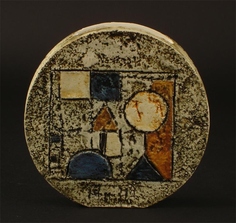 A Troika Wheel vase modelled in low relief, in shades of blue and ochre on a green ground painted marks LK monogram 11.5cm. high