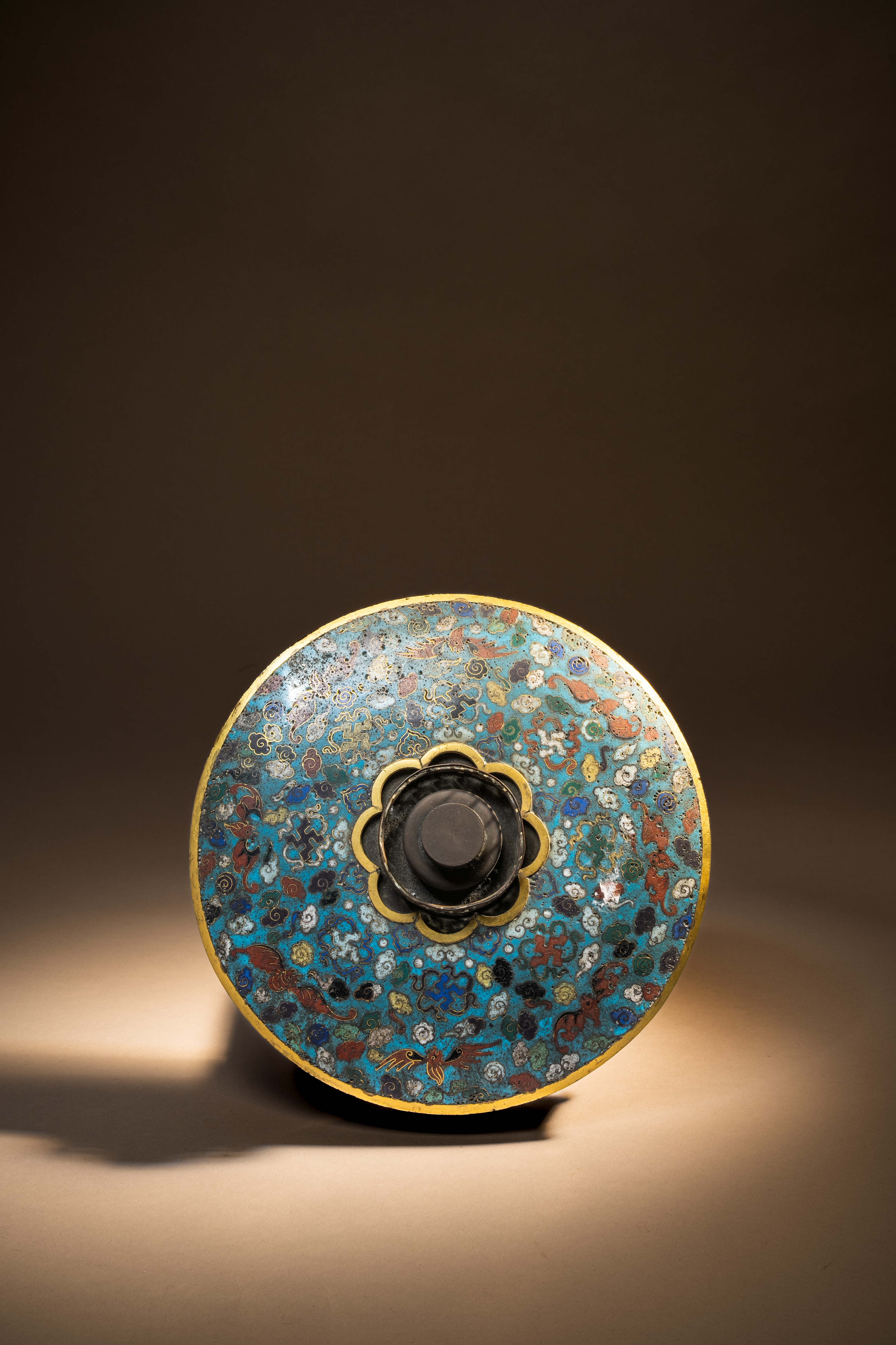 The shallow domed top decorated with eight red bats encircling eight wan characters amidst cloud scrolls on a turquoise ground, all around a central collar. The plain drum-shaped base with two bands decorated with flowers, 1.26kg, 21cm wide, 6.8cm high.