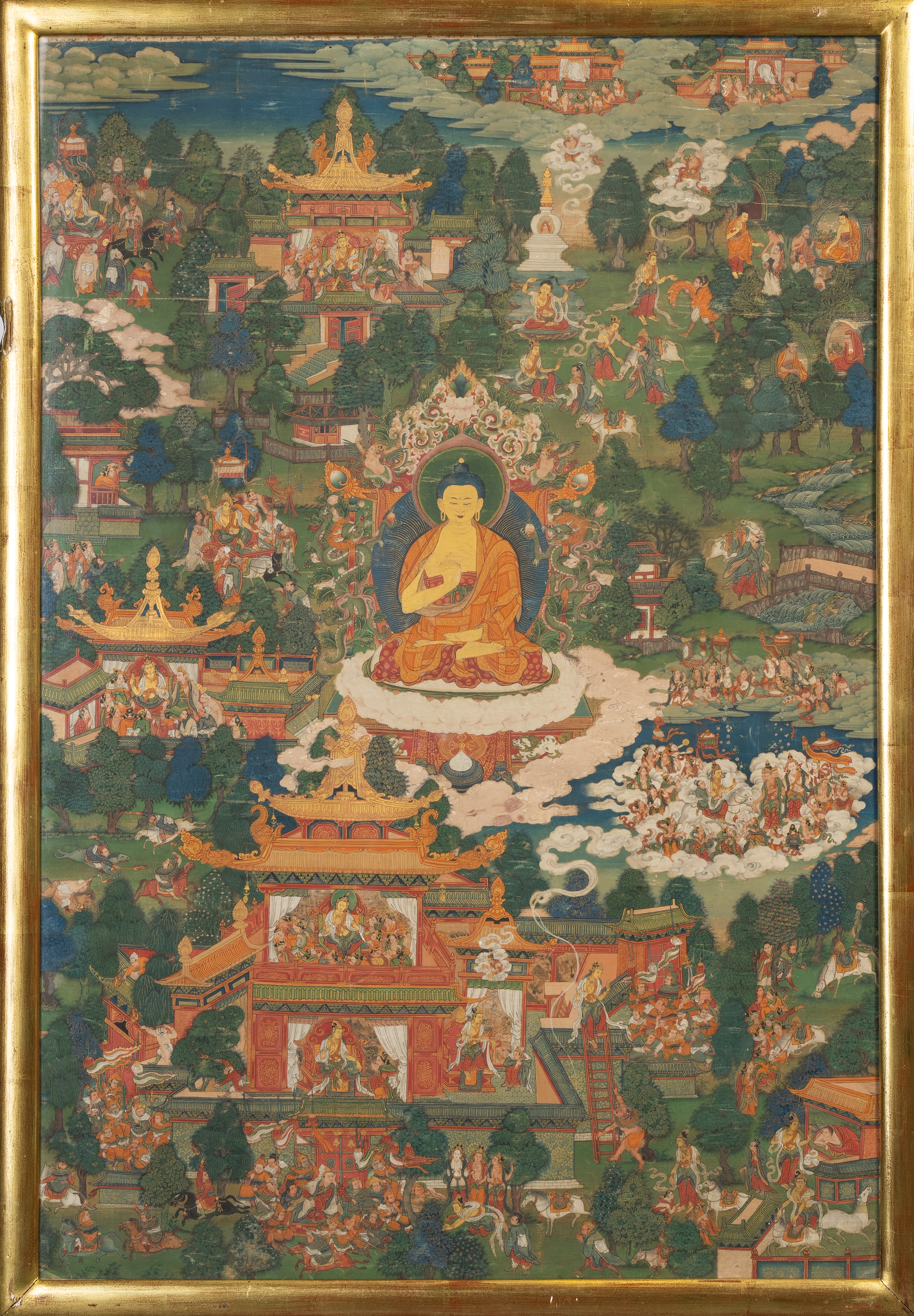 A TIBETAN THANGKA PAINTED ON SILK, DEPICTING SCENES FROM THE LIFE OF THE BUDDHA SHAKYAMUNI