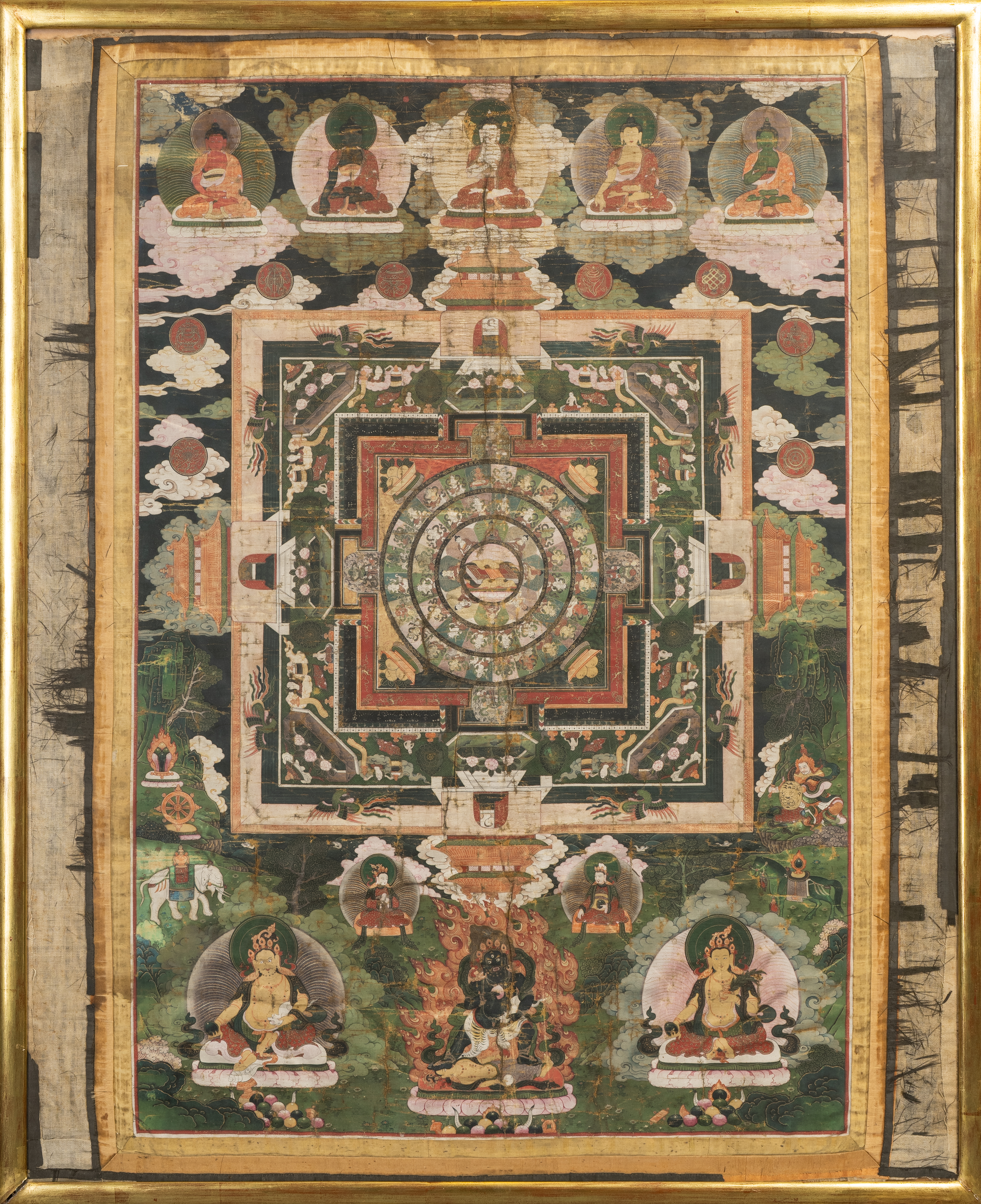 The centre depicts the mandala, a geometric composition formed of circles inscribed within squares, all within four monumental gates guarded by the Four Kings. Within the concentric circles are represented twenty-four dharmapala, (Defenders of the Religion), sixteen bodhisattva (future Buddhas) and eighteen human Buddhas, in the centre is the Book of the Law. The upper section has five further figures of Buddha, below are the Blue Mahakala, Kubera and Tara, framed and glazed, 87cm high, 58.5cm wide.