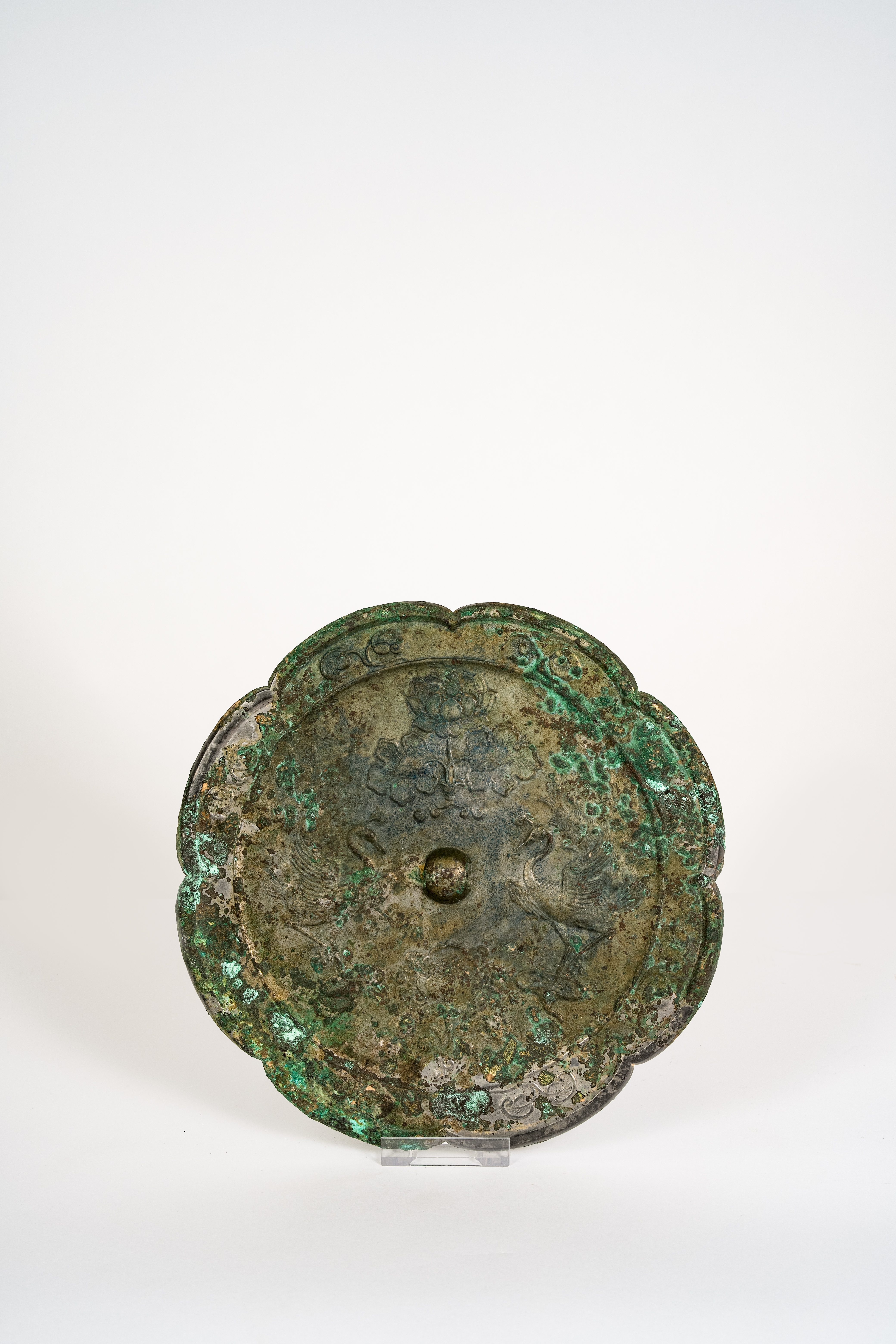 Cast with two cranes and two peonies in relief around a central boss, the lobed rim with eight pairs of leaves, the surface heavily encrusted and corroded, 1.6kg, 24.2cm.