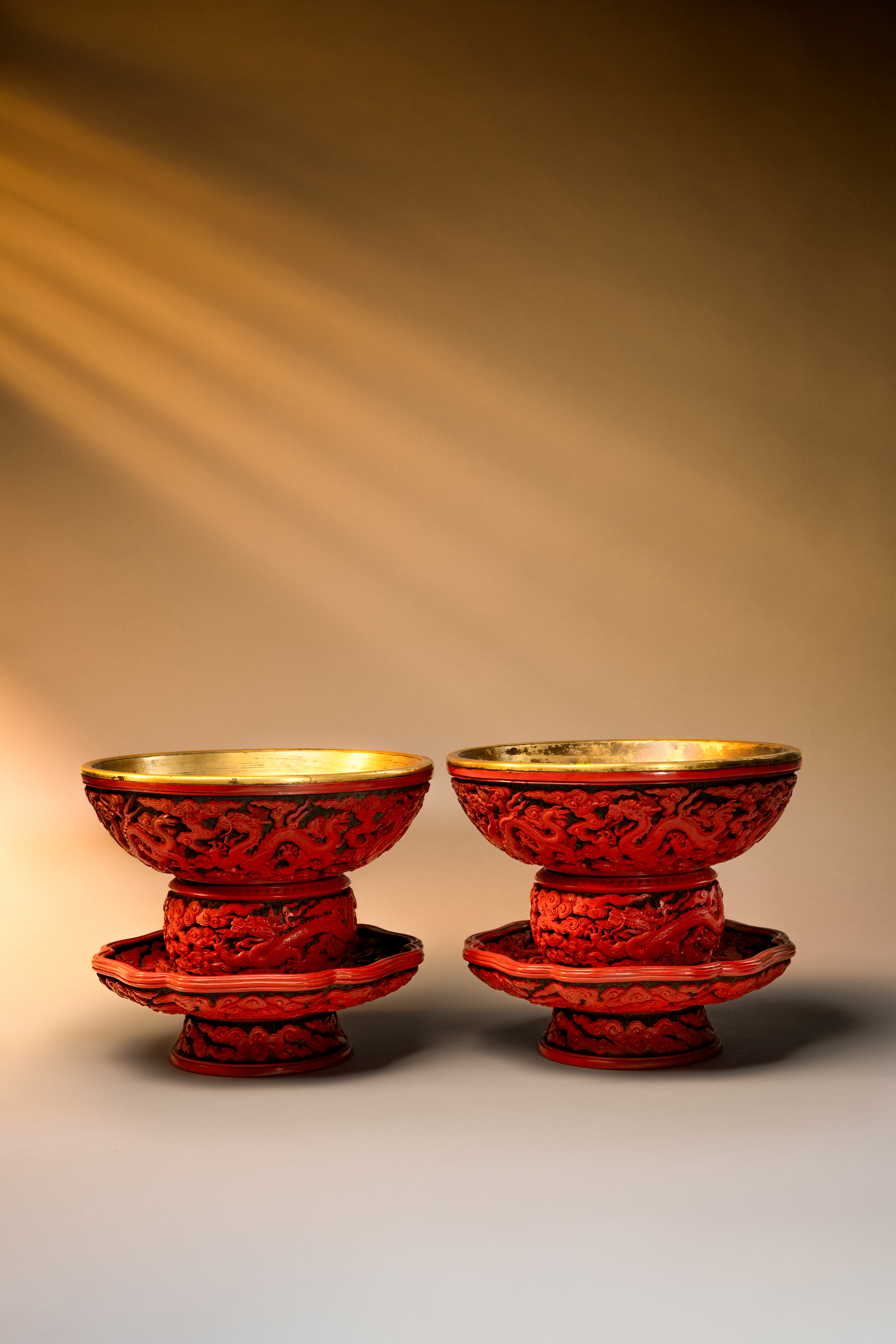 A RARE PAIR OF CHINESE IMPERIAL CARVED CINNABAR LACQUER ‘DRAGON’ BOWLS AND STANDS