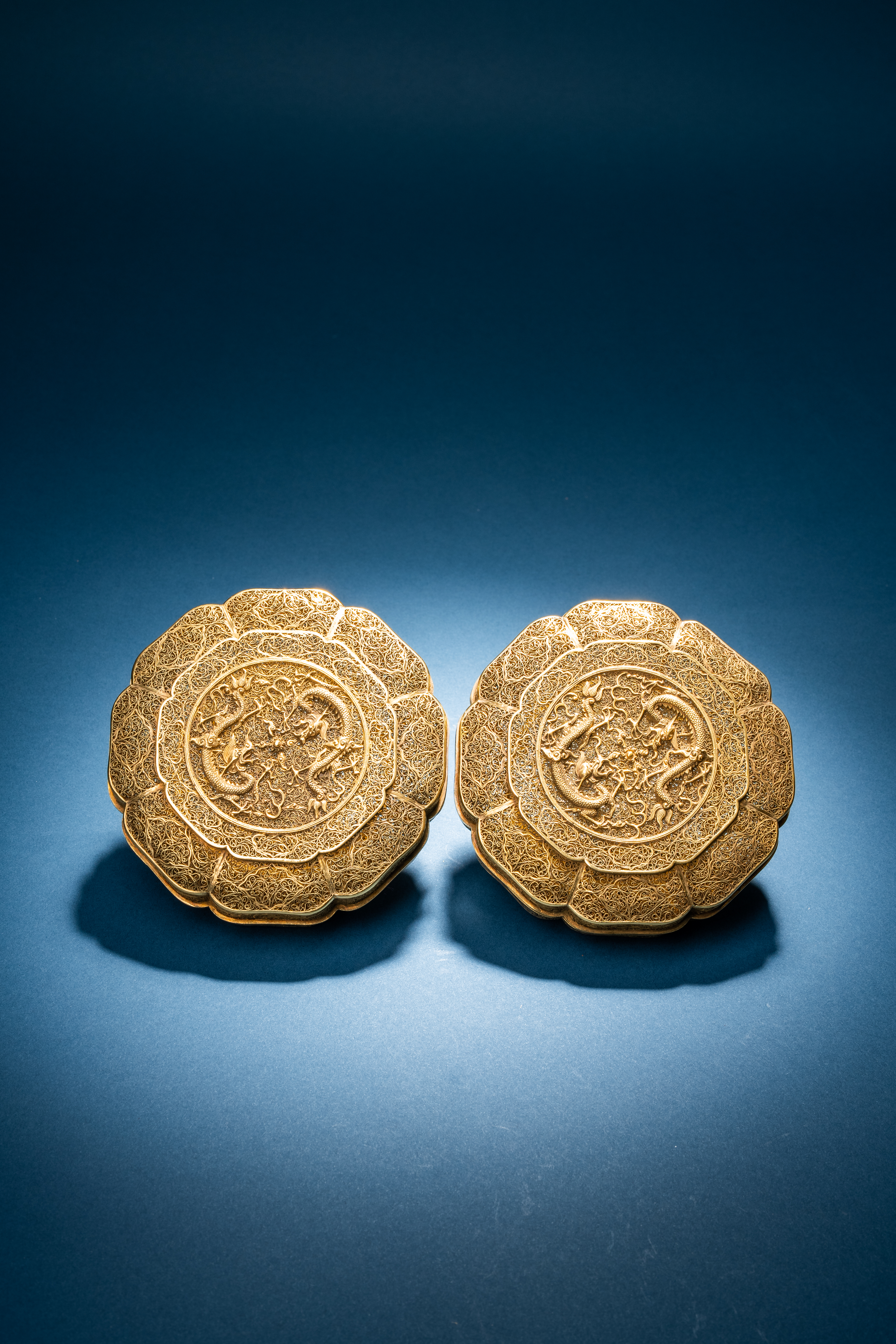 A PAIR OF RARE CHINESE IMPERIAL SILVER GILT FILIGREE ‘DRAGON’ MALLOW-FORM BOXES AND COVERS