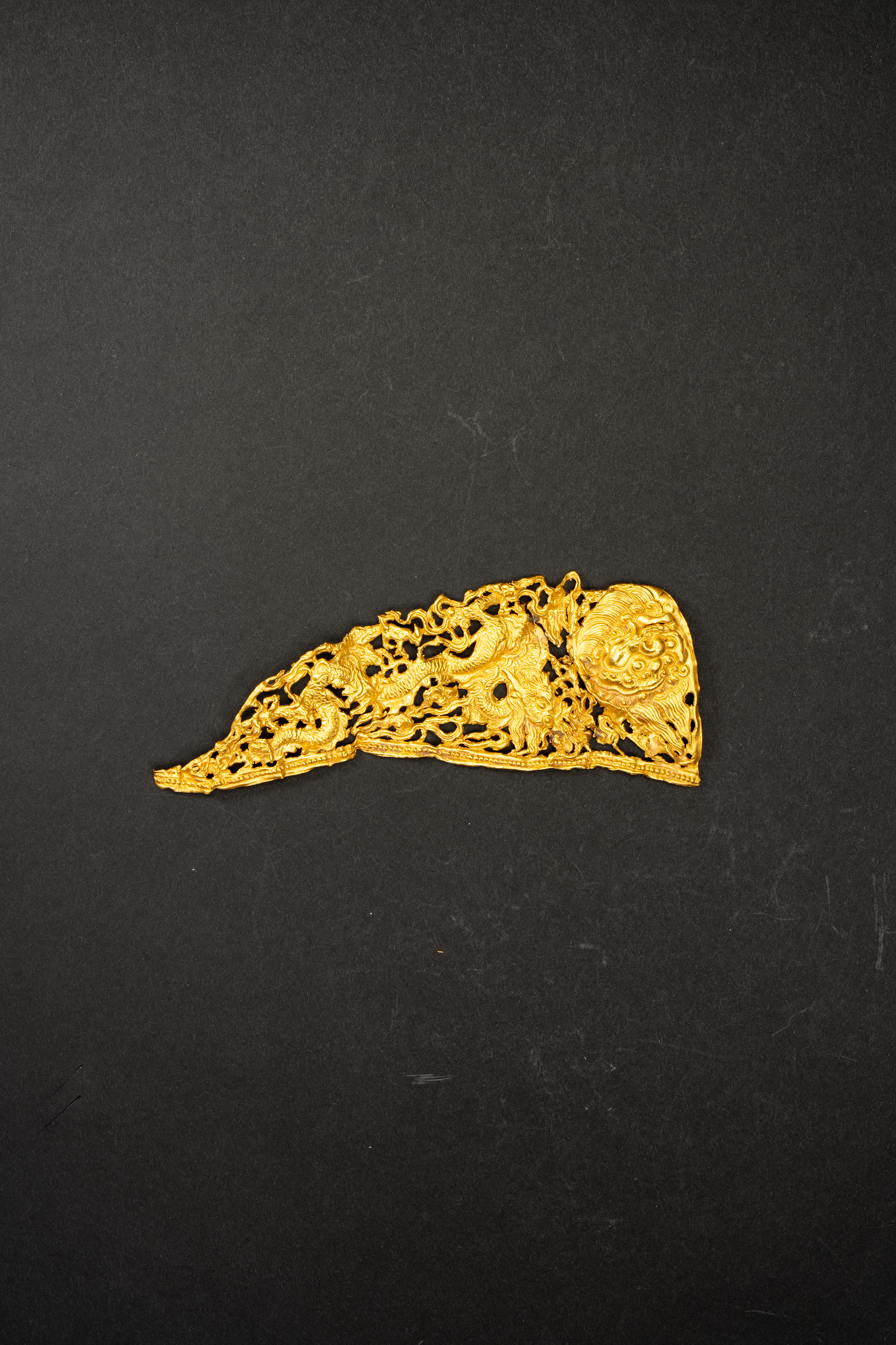 Gold was limited in its use by the Ming dynasty sumptuary laws and was largely restricted to members of the Imperial family. Very few comparables have survived, other than a pair of gold plaques formerly in the collection of George Eumorfopoulos and Sir Bernard Eckstein, set with semi-precious stones from the Xuande period (1426-35), which are now in the British Museum, cf. Ming, 50 Years that Changed China, pp. 108-9, fig.98.