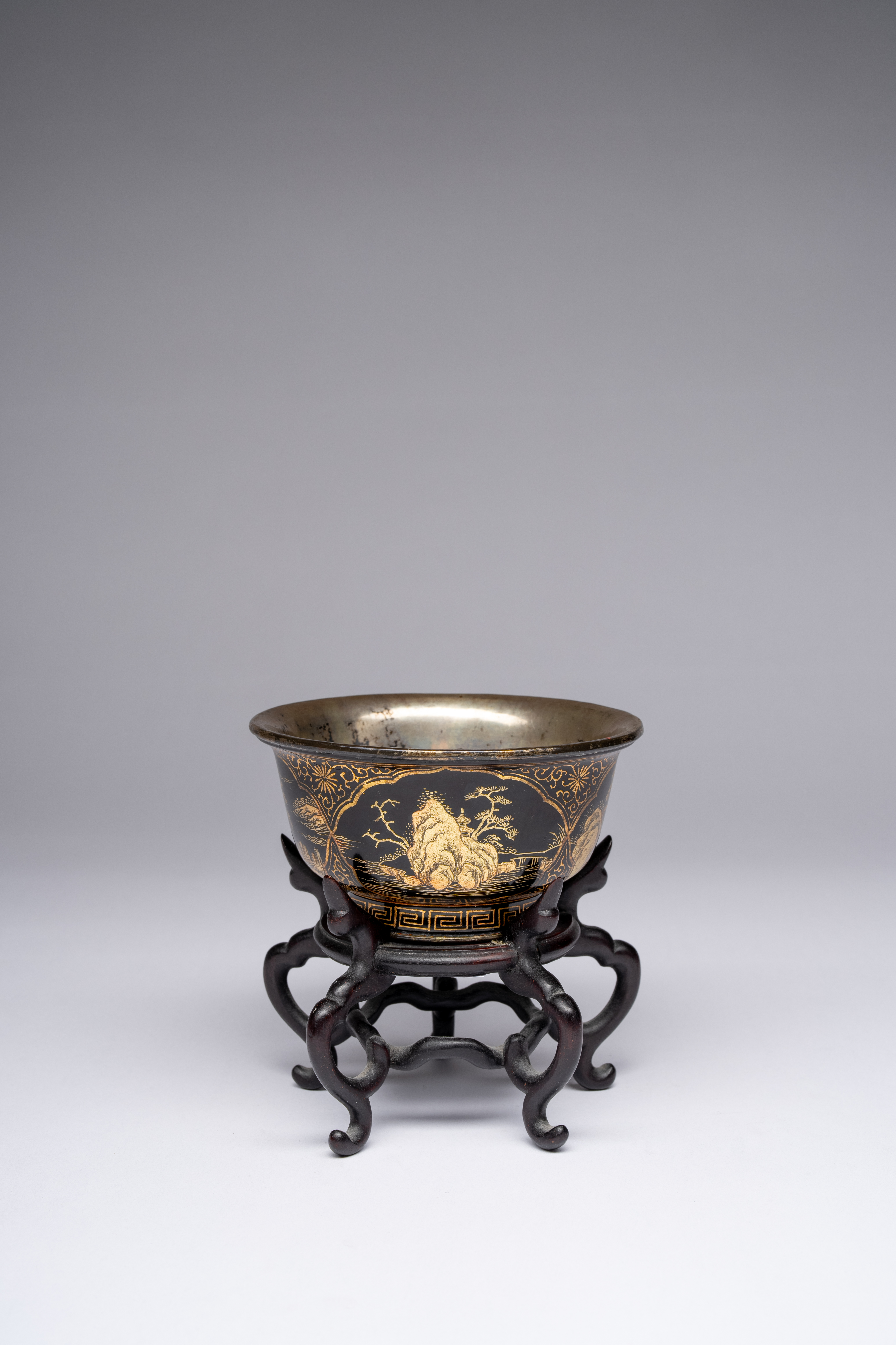 The rounded bowl decorated to the exterior with four cartouches containing romantic landscapes and with spandrels decorated with flowerheads and tendrils, the interior and base mounted with silver linings, together with a wood stand, 10cm. (2)