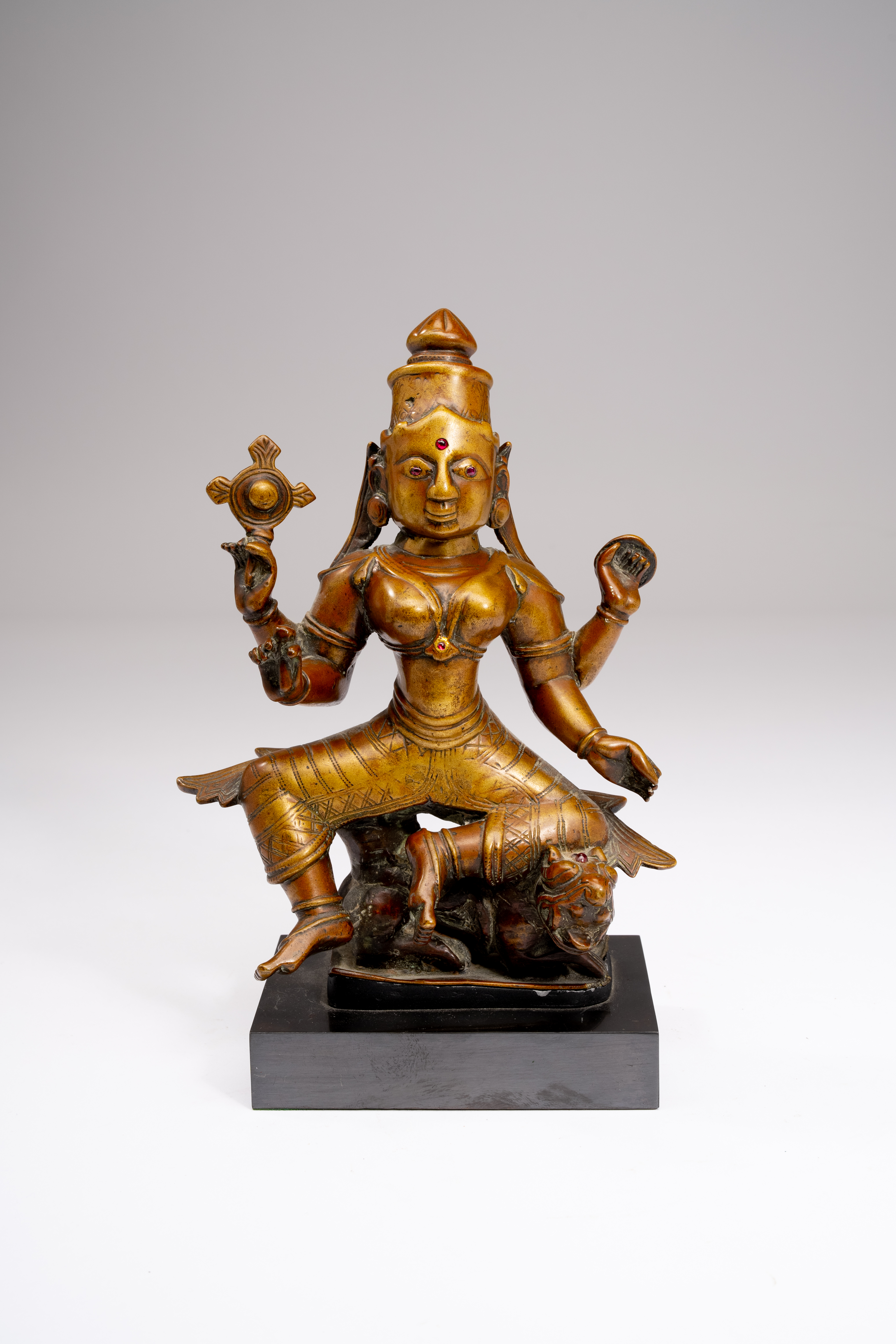 Seated in lalitasana on a crouching mythical beast, holding various attributes in her four arms, her almond-shaped eyes and necklace adorned with coloured stones, together with a modern stand, 3.3kg, 21cm. (2)
