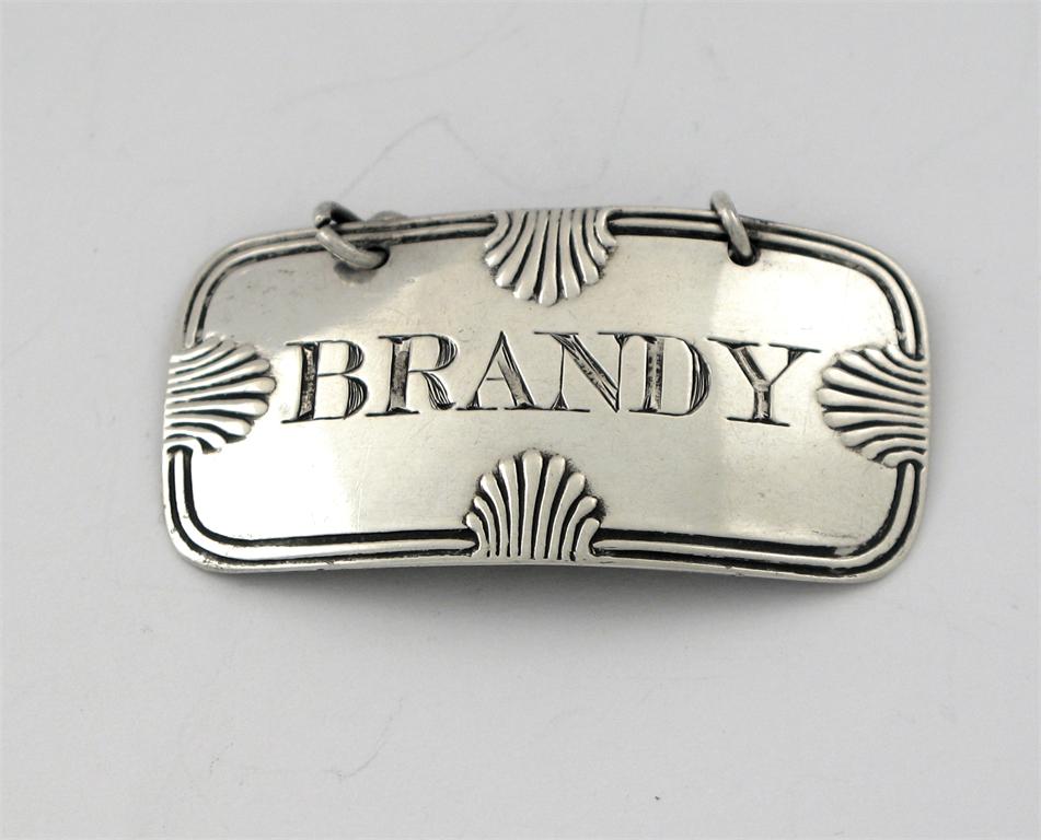 An early Victorian oblong label, with reeded and shell border, incised 'BRANDY', by George Unite, Birmingham 1840.