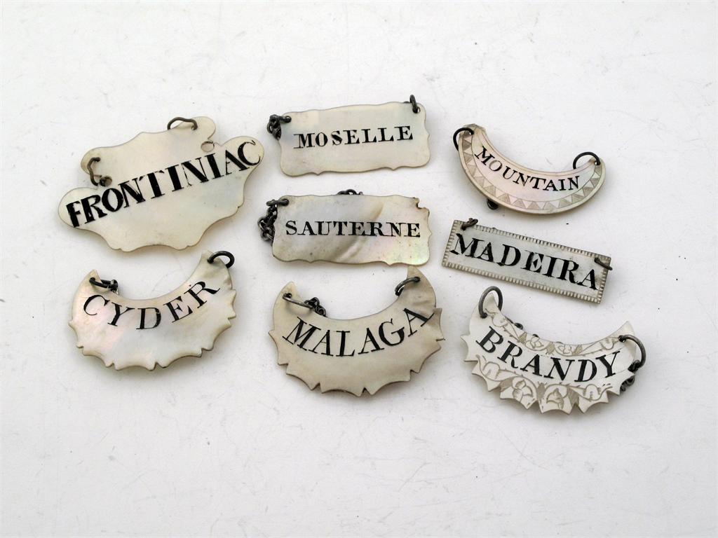 Eight various George III mother of pearl wine labels: a "Frontiniac" escutcheon, a pair of wavy edge "MOSELLE" & "SAUTERNE" a pair of shaped crescents "CYDER " & "MALAGA", an engraved "MOUNTAIN" crescent, an engraved and shaped crescent "BRANDY" and a "MADEIRA" oblong. (8)
