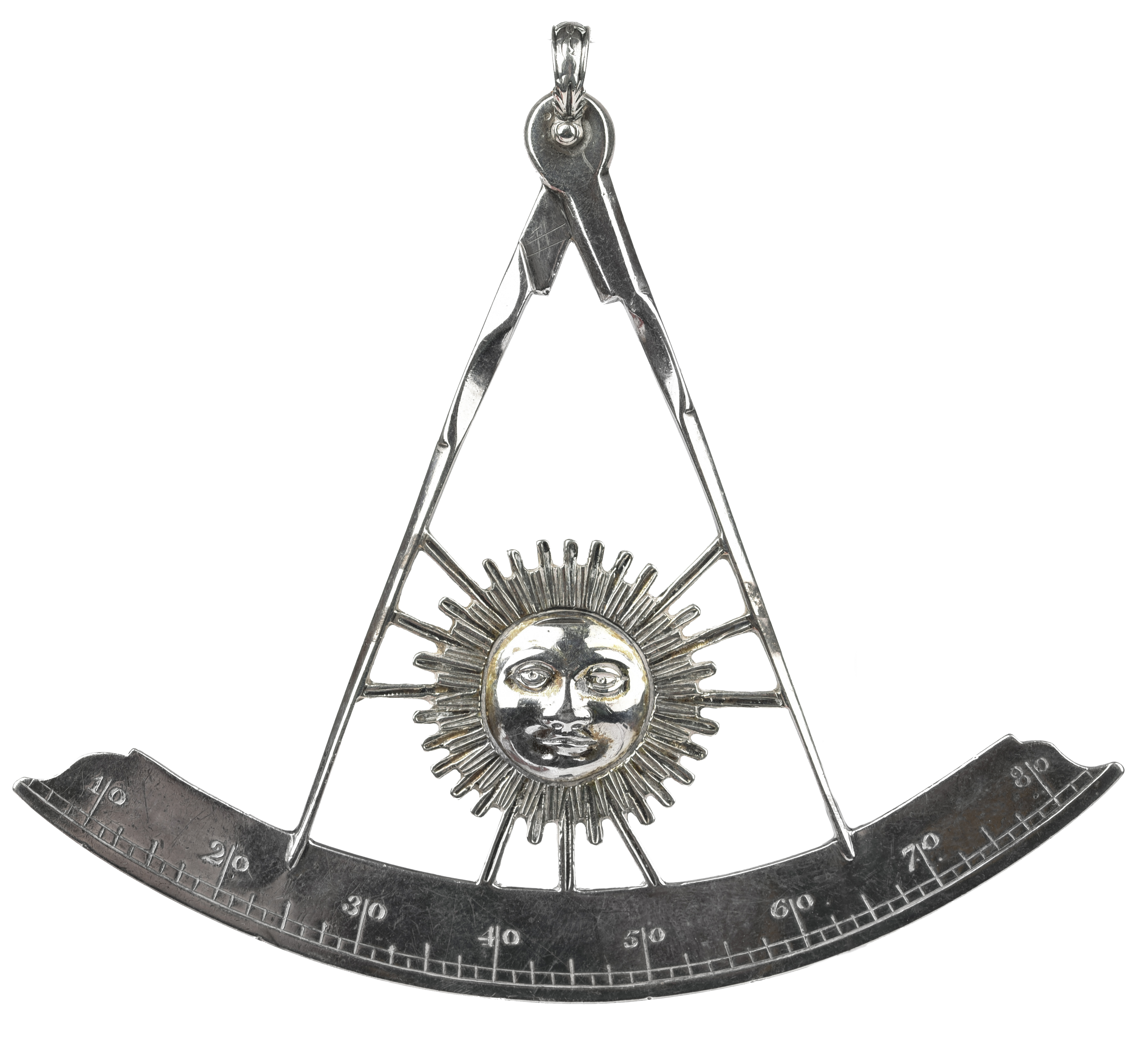 Freemasonry: a fine Georgian silver Worshipful Master's Jewel, openwork form 114mm, compasses with graduated scale, a sun in splendour between the arms, loop suspension with moulded foliate details, Peter, Ann & William Bateman, London 1802, extremely fine or nearly so.