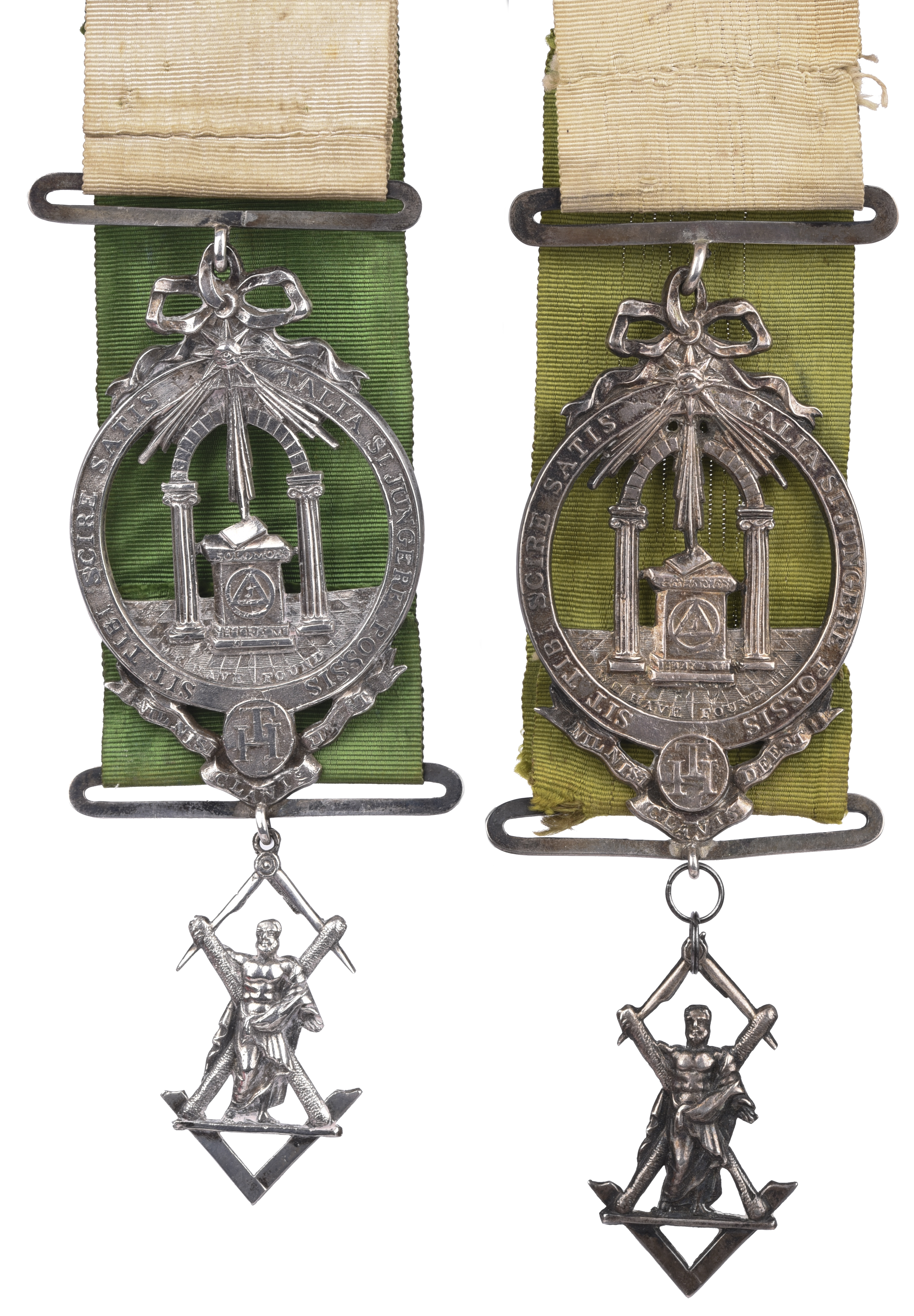 Scottish Freemasonry: a family pair of Grand Lodge Centenary Medals 1836, named to James M. Robertson and to H. Robertson, of matching openwork form 45mm wide, an arch within a circular border, lower extension with a banner incorporating a medallion with a triple tau, pendant figure of St Andrew with compasses and square above and below, suspension bracket in the form of a ribbon bow, the ribbon fixed to the top and bottom of the main ornament by straight bars, good very fine; cased together. [2]