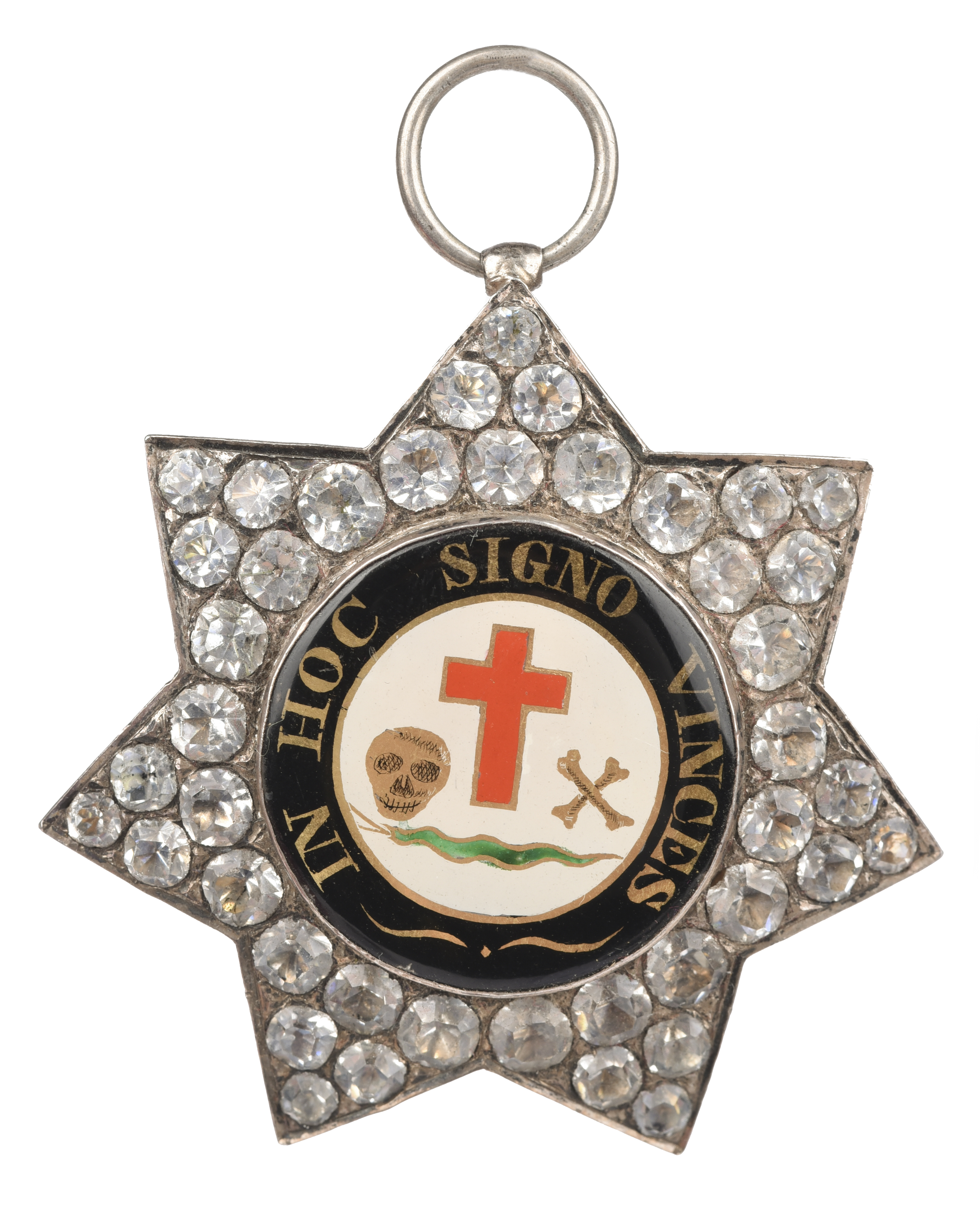 Templar Freemasonry: a 'Knights Templar' paste-set and enamel pendant star, seven pointed star 45mm, the points set with simulated diamonds, the centre with a glazed and enamelled roundel displaying a red Latin cross with a skull and crossed bones to either side and 'IN HOC SIGNO VINCES' to a blue border, ring suspension, 19th century, extremely fine; associated case.