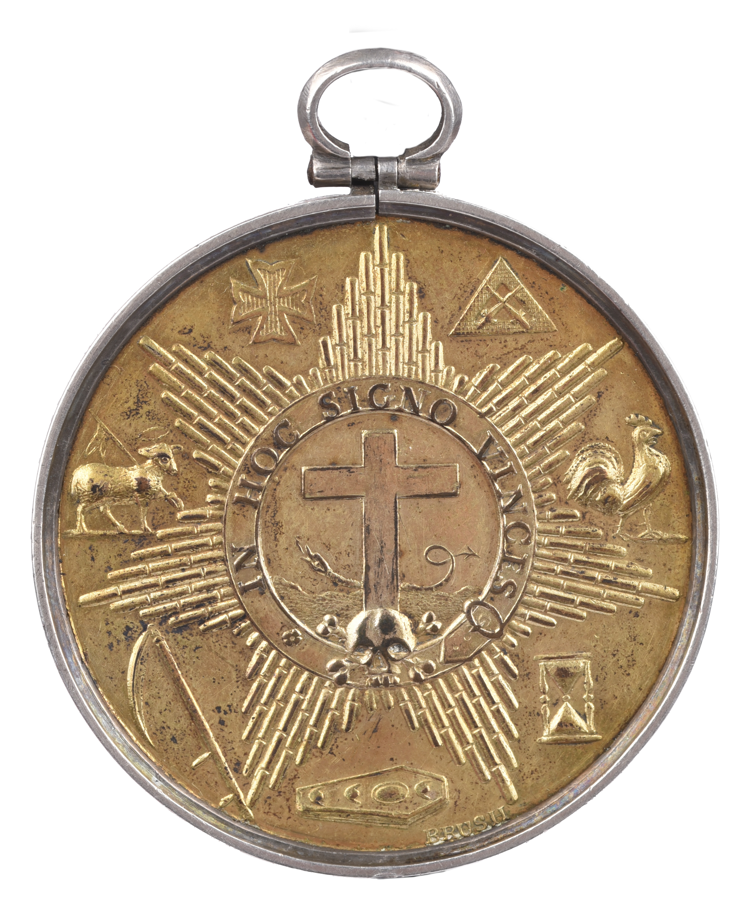 Freemasonry: a Georgian gilt 'Brush Jewel', circular form 44mm, each side covered in Masonic emblems in relief, held in a loose mount supporting a hinged suspension ring, the edge of the mount engraved 'GIFT of BR HUNTER to HIS SON 24 SEP 1802', good very fine or better.