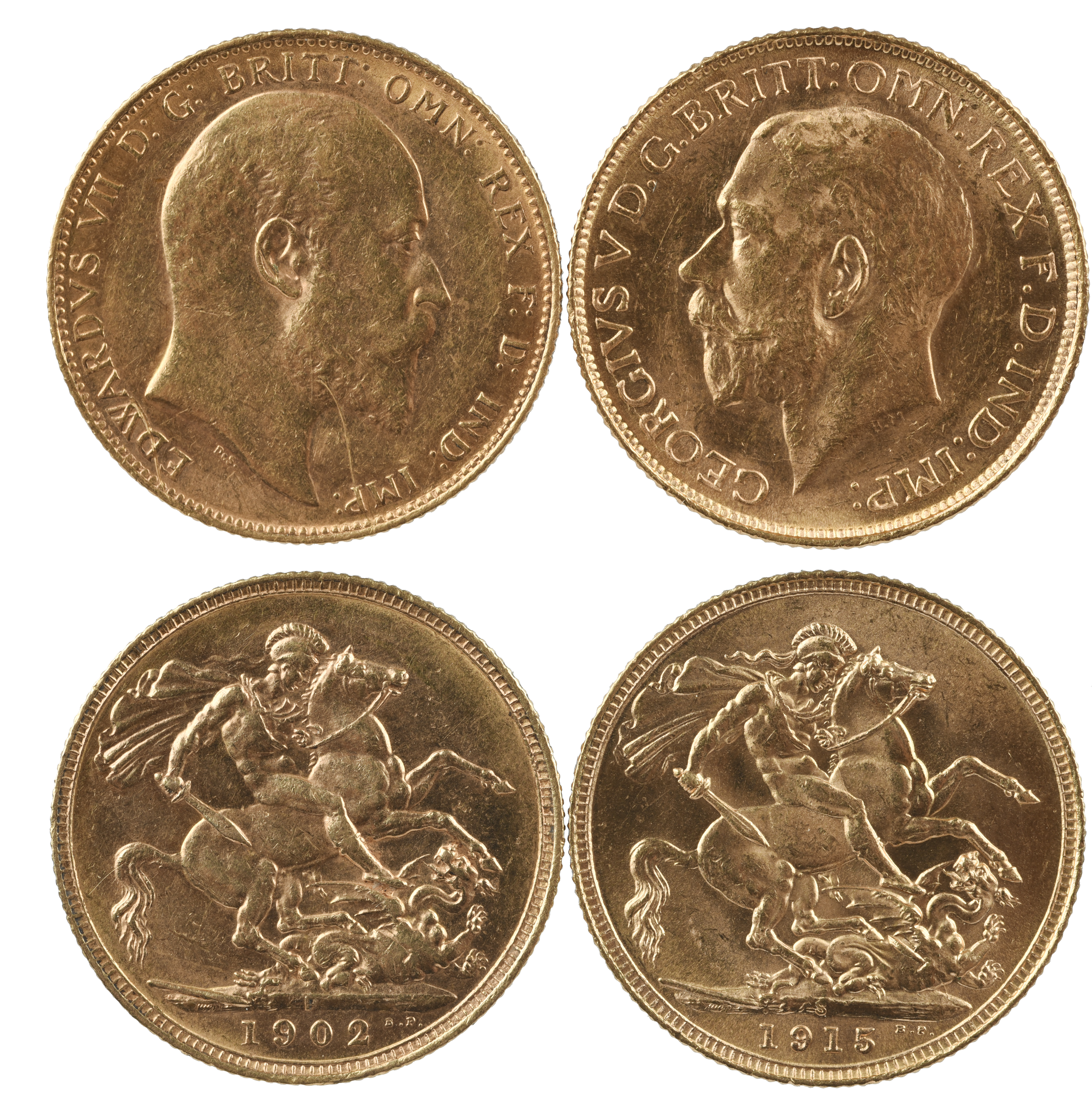 Edward VII: gold sovereign, 1902, Perth mint (S 3972), nearly extremely fine; George V, gold sovereign, 1915, Sydney (S 4003), about extremely fine. [2]