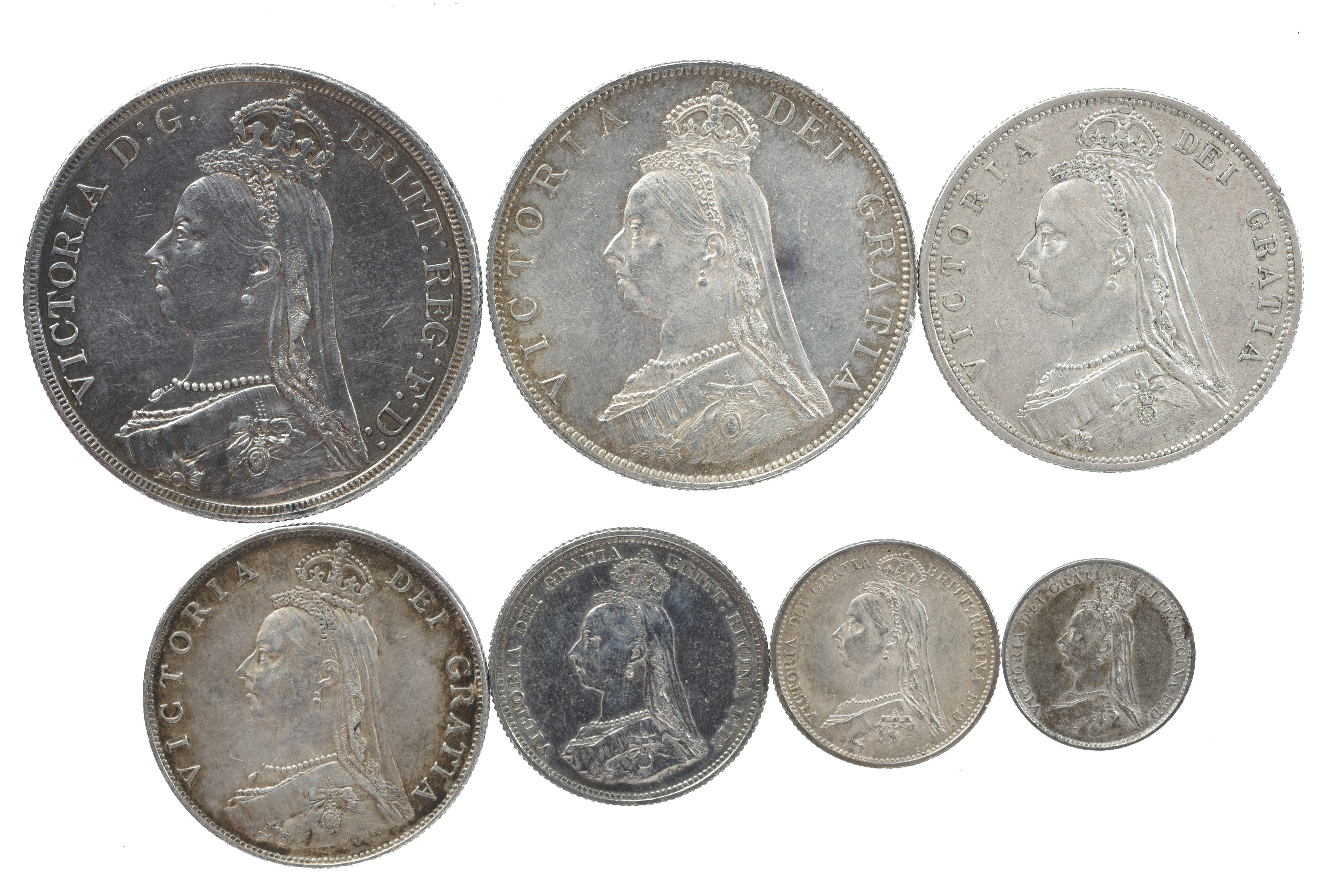 Victoria: an assembly of silver coins, 1887, corresponding to the seven coin specimen set: crown (S 3921), very fine or better and toned; double florin, Roman I in date (S 3922), nearly extremely fine; half crown (S 3924), very fine; florin (S 3925), very fine; shilling, small head (S 3926), very fine; sixpence, shield in garter (S 3928), about extremely fine; threepence (S 3931), good very fine. [7]