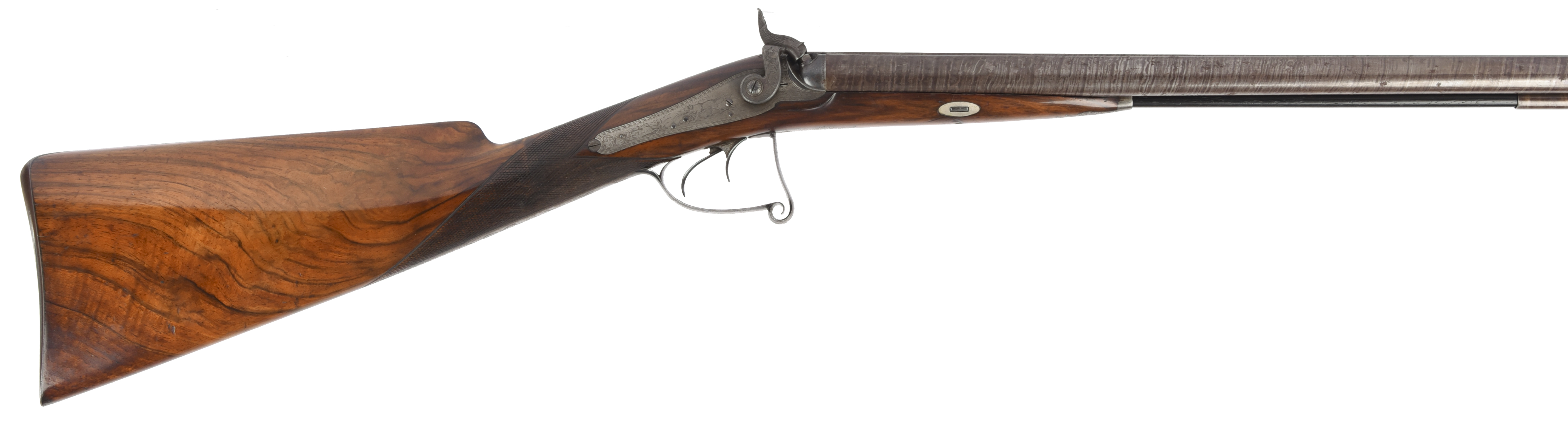 An American 16 bore double percussion gun by or for John Mullin of New York, twist browned imported barrels 30 in., with Birmingham proof marks, hollow top rib engraved 'JOHN MULLIN NEW YORK', rib extension over breech plugs engraved with a dog's head, tang and top strap profusely engraved with intertwining foliate scrolls; back action locks engraved with game scenes involving pointer dogs and birds and with geometric borders, scroll front trigger guard with further fine scroll and game engraving, figured straight hand stock, steel butt plate with game scene and foliage engraved to the tang, brass tipped ram rod with concealed worm; in an associated oak case with brass roundel to the lid, with associated accessories comprising: embossed powder flask, leather shot flask, oil bottle, cleaning rod and turn screw.