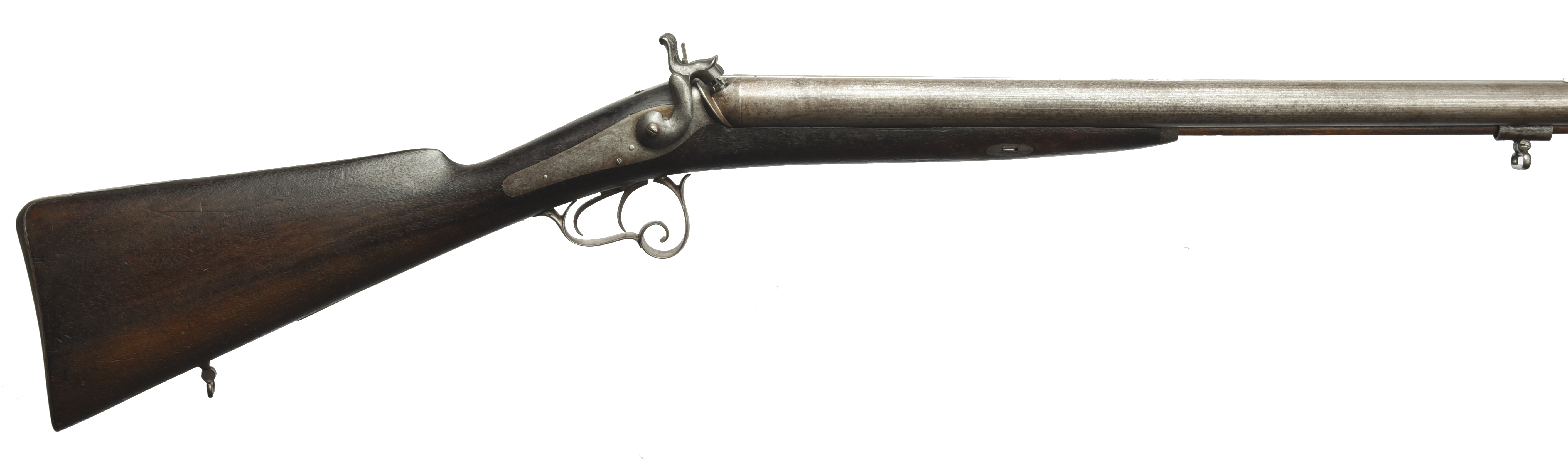 A 14 bore percussion double gun, barrels 34 in, hollow top rib, adapted for use with ball by the addition of a back sight to the tang, back action locks, walnut straight hand stock, steel furniture including a scrolling Continental type trigger guard, steel tipped wooden ramrod.
