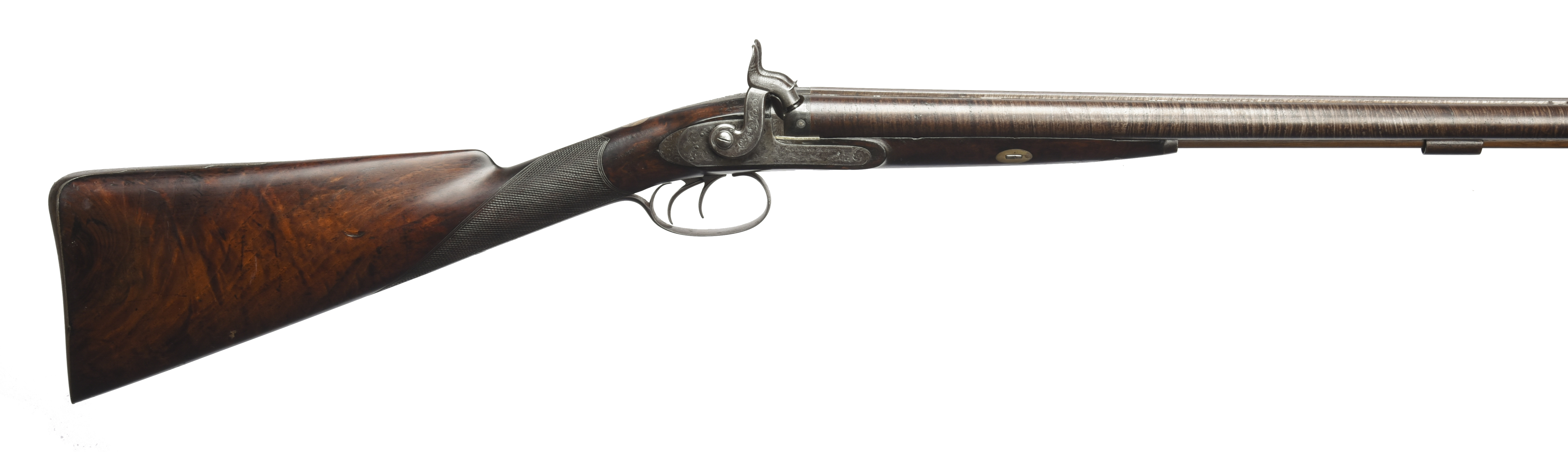 A 16 bore double percussion gun, twist-browned barrels 28 in., hollow top rib inscribed 'STIRLING BURNLEY', breech engraved with a snipe, scroll engraved tang; locks engraved with game birds amid scrollwork and inscribed 'STIRLING BURNLEY', lock plates chamfered at the rear, scroll engraved hammers; chequered straight hand stock of figured walnut, pineapple finial trigger guard, steel butt plate with stepped and engraved strap, inlaid with an initialled oval in front of the wrist, later brass mounted wooden ram rod with ball puller under a screw-off cap.