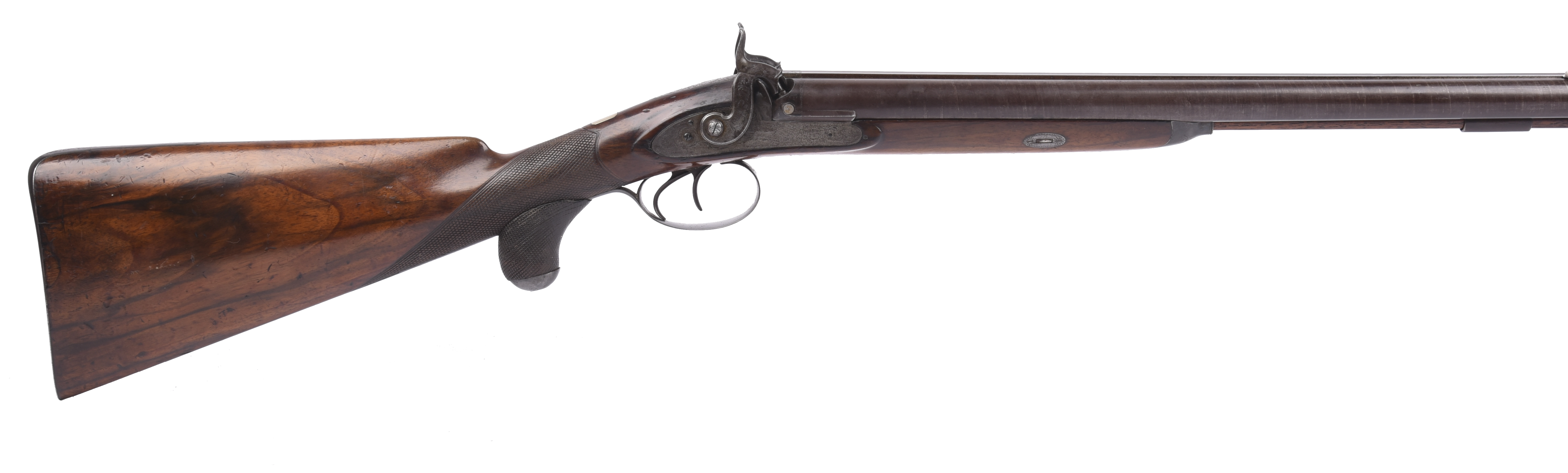 An English 12 bore percussion double gun, twist barrels 29.75 in., hollow top rib inscribed 'JOHN WIGGAN MAKER TO THE ROYAL FAMILY & THE PACHA OF EGYPT' [sic], engraved hook breech with platinum vent plugs, numbered 2265; well engraved locks with scrolls and each with a scene of a dog and a pheasant, each inscribed 'JOHN WIGGAN'; half stocked in walnut, the chequered grip fitted with a pistol extension, engraved steel furniture, brass tipped wooden ram rod; in a scarce type of slide-out fitted case with accessories comprising powder flask, shot flask, cap tin and glass oil bottle.