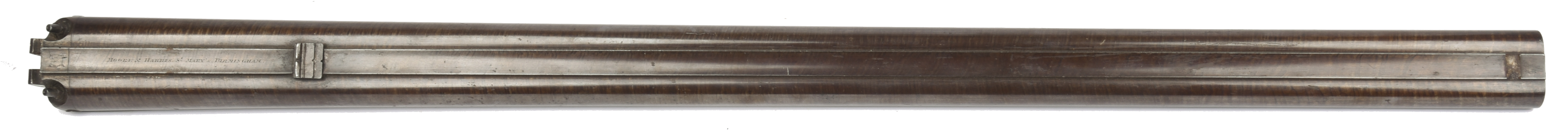 A pair of English 'damascus' percussion double rifle barrels, approximately 16 bore, 29.75 in., nine-groove rifling, hollow top rib inscribed 'MOORE & HARRIS. ST MARY'S. BIRMINGHAM', hook breech engraved with the head of a big cat, Birmingham proof marks, standing back sight with two folding leaves, numbered 1251.
