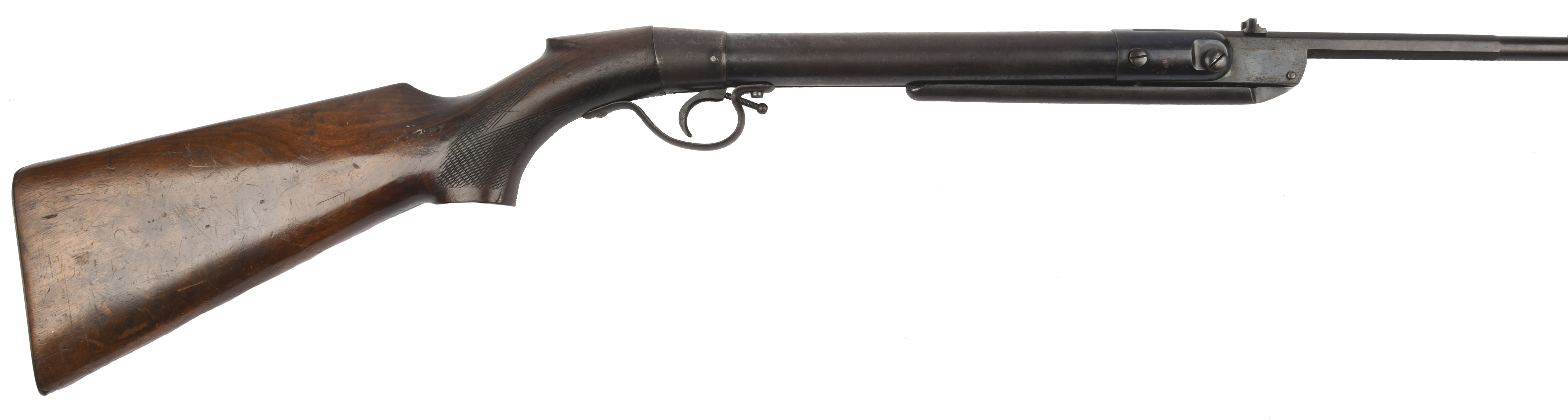 A pre-Second World War German .177 air rifle, by Precision, two stage sighted barrel of hexagonal section at the breech, break barrel action with unlocking lever to the left, chequered pistol grip butt.