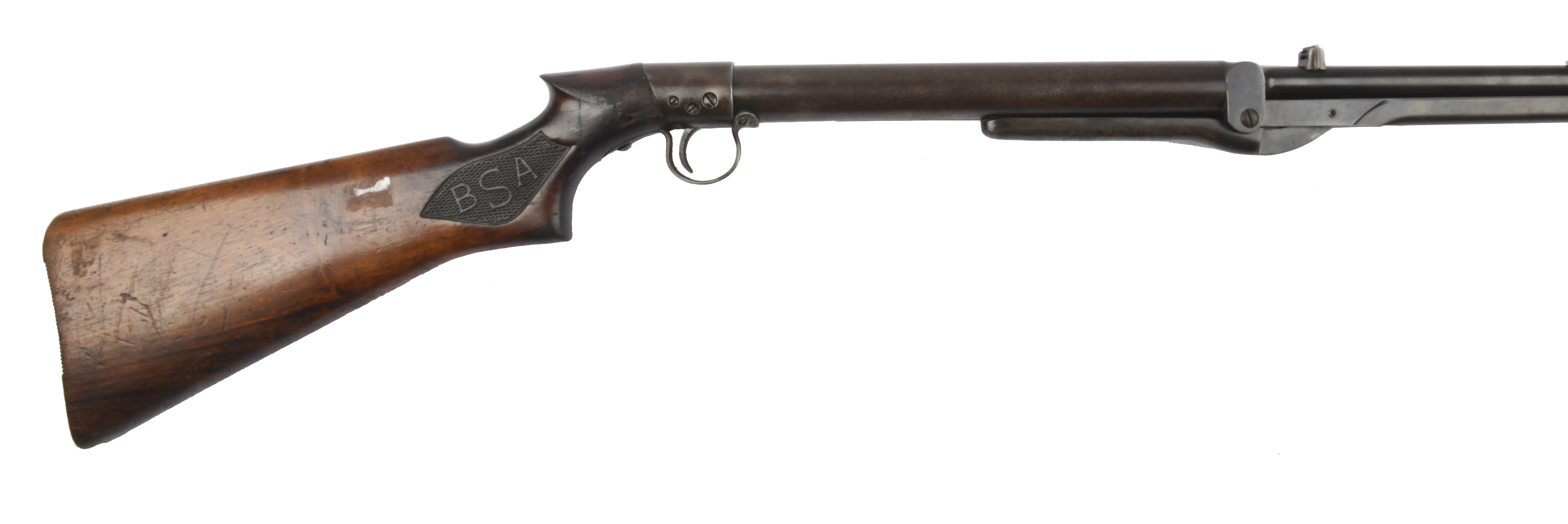 A pre-Second World War .22 air rifle by B.S.A., serial number S42120, under-barrel charging lever and rotating loading gate, elevation adjustable back sight, pistol grip butt, chequered panels embossed 'B.S.A.'.