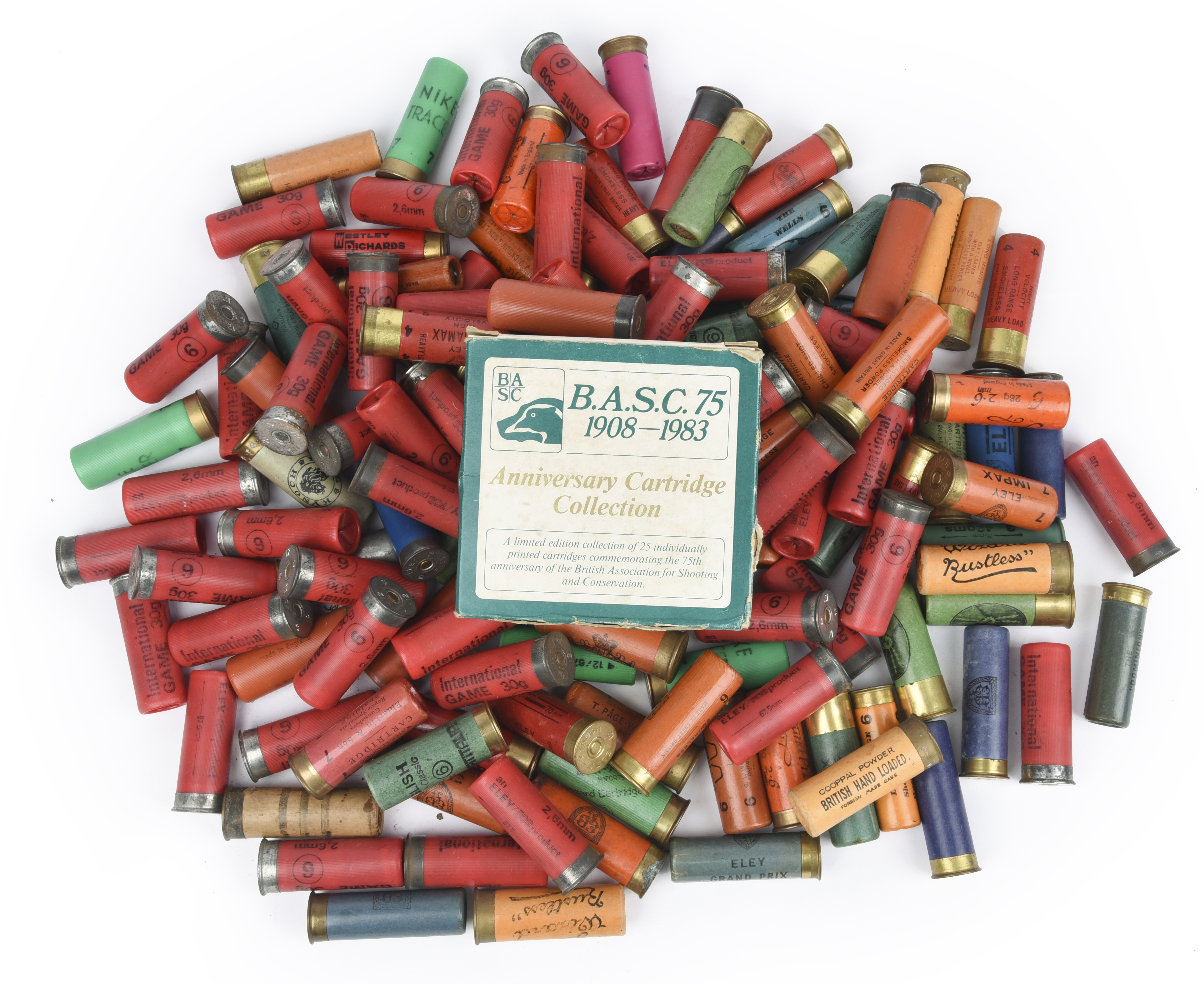 A quantity of shotgun cartridges including collectable examples, among which a B.A.S.C. Anniversary Cartridge Collection 1983 comprising 25 individually printed 12 bore cartridges commemorating important events in the history of the association and in original box, together with a variety of vintage cartridges in various sizes. [qty]