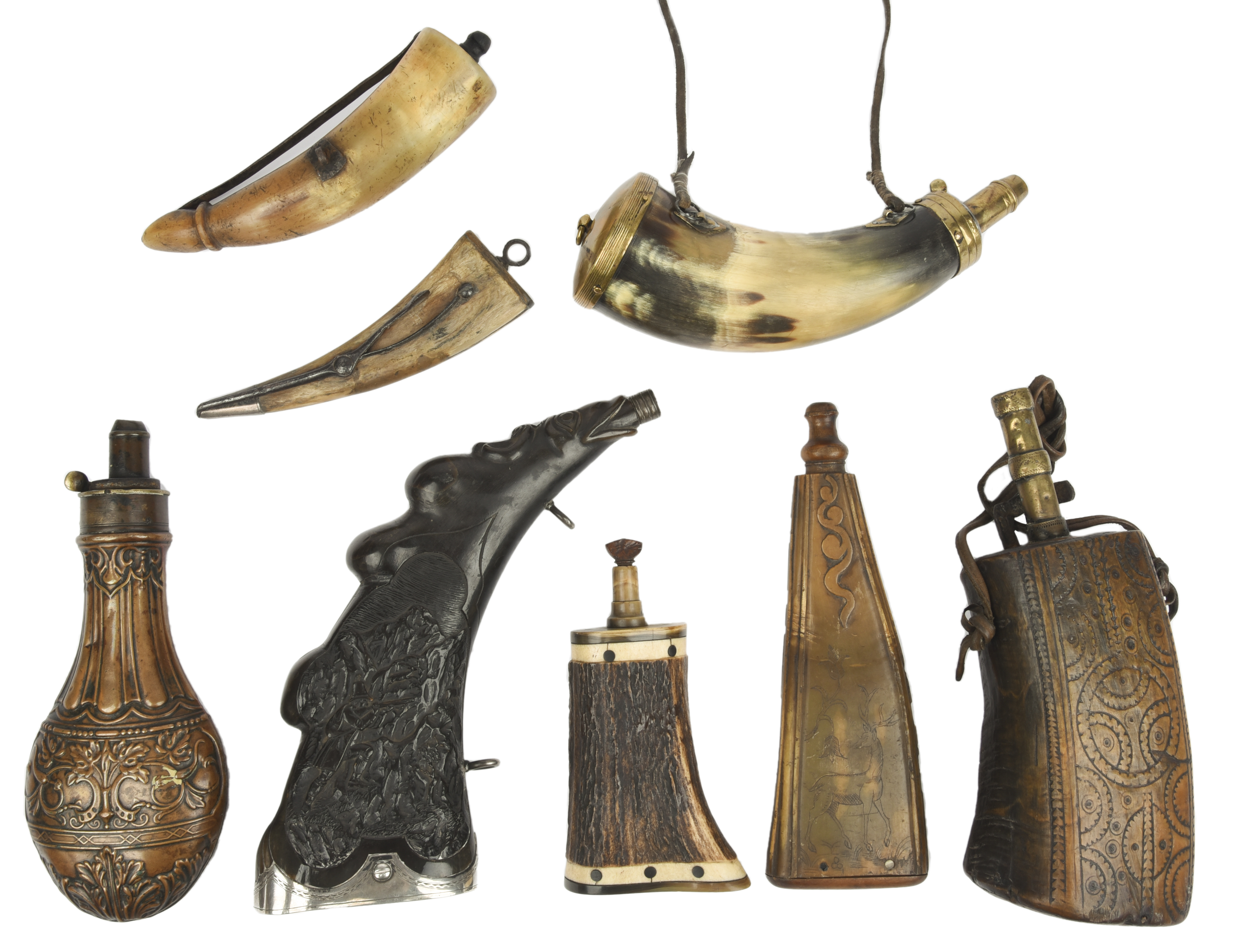 A collection of horn powder flasks, comprising: a 19th century German white metal mounted example, 26cm, carved to either side with Alpine hunting scenes, the convex edge with a series of lobes, the top carved with a bestial head and the base enclosed in border engraved white metal; an 18th century European flask, 20cm, triangular form, fluted edges and turned spout, the sides engraved with a stag to one side and a woman docking a dog's tail to the other; a Near Eastern example, possibly Turkish, with geometric pokerwork decoration and a brass spout; and four others; together with an embossed copper flask with brass spout. [8]