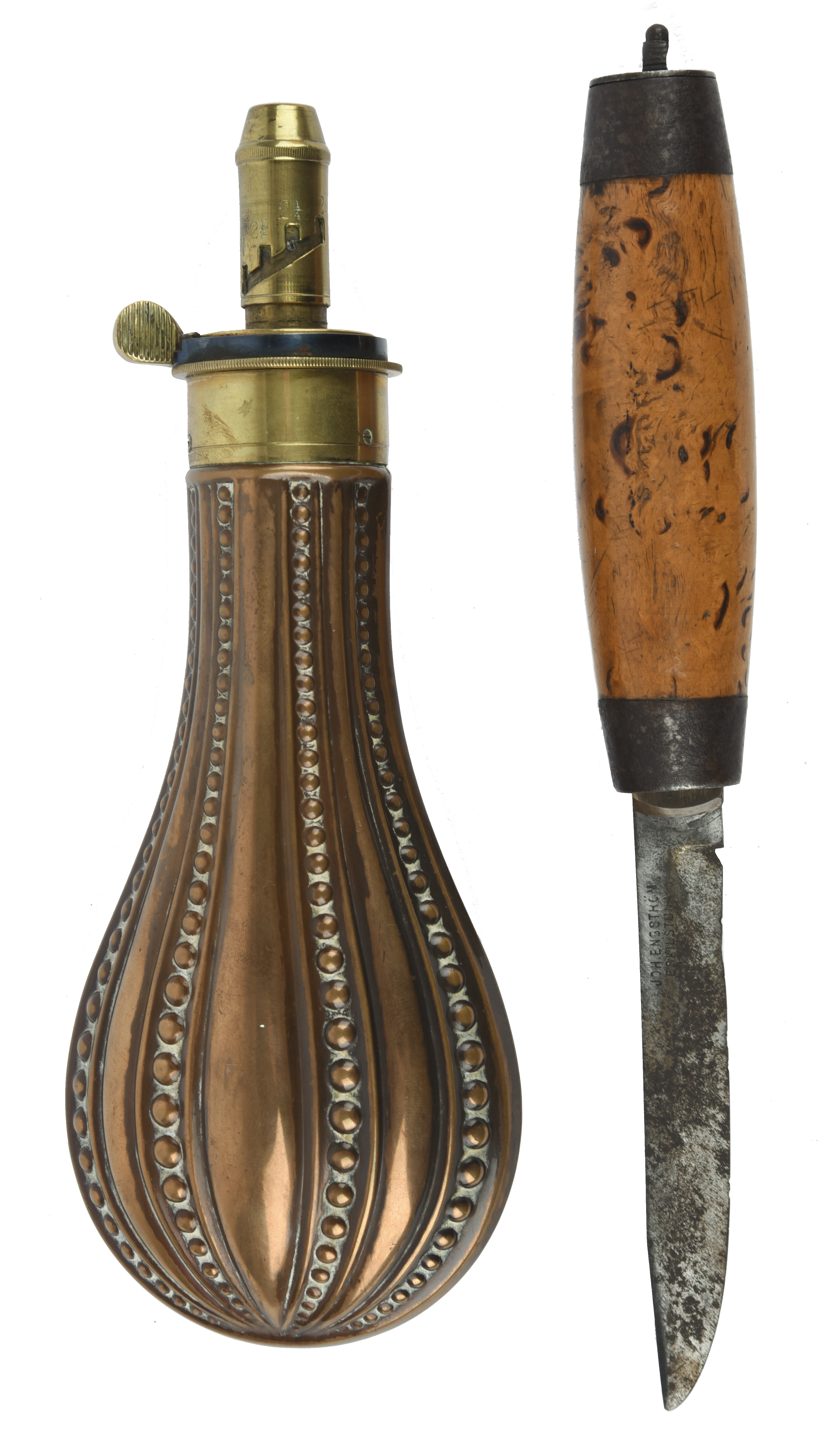 An embossed copper powder flask by James Dixon, fluted and beaded body, brass top with sprung shutter and adjustable measuring spout; together with a Swedish folding knife by Engström, bulbous burr wood handle with slide out brass frame supporting a folding clip-point blade. [2]