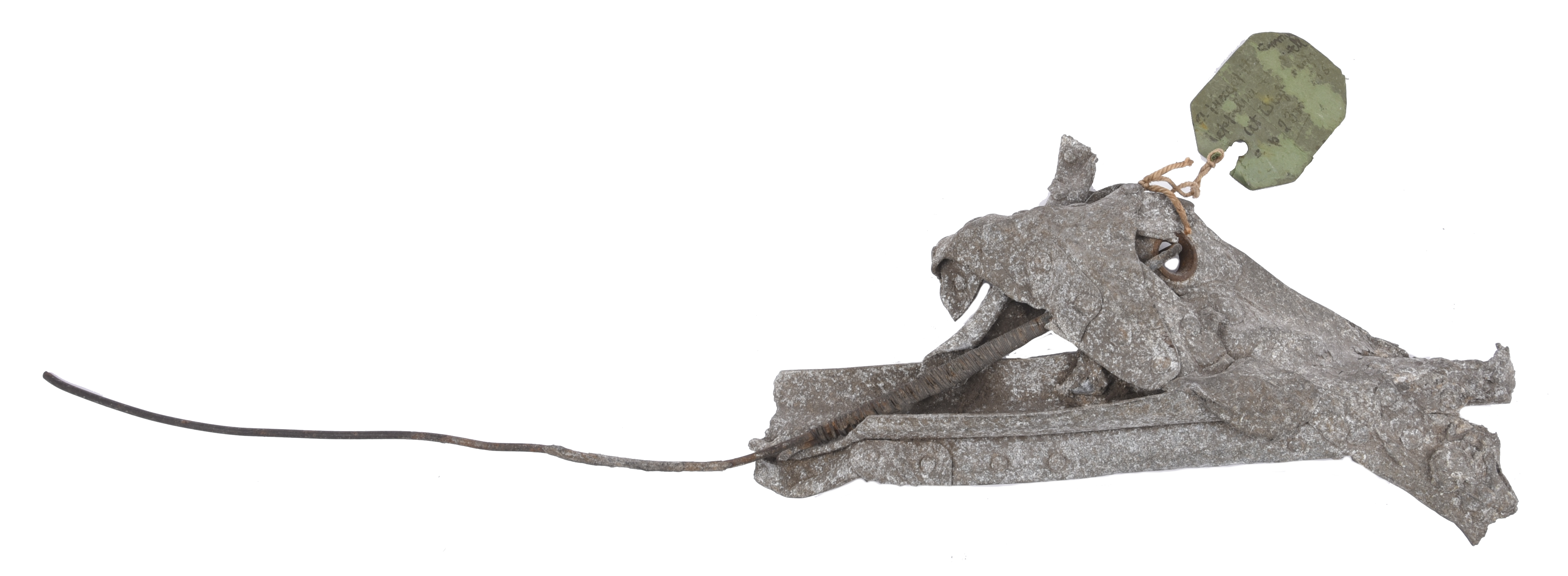 An item of Great War Zeppelin wreckage, being a crumpled piece of aluminium framework with a section of steel wire attached by way of a grommet; and old collector's label stating that it is part of the Little Wigborough airship.