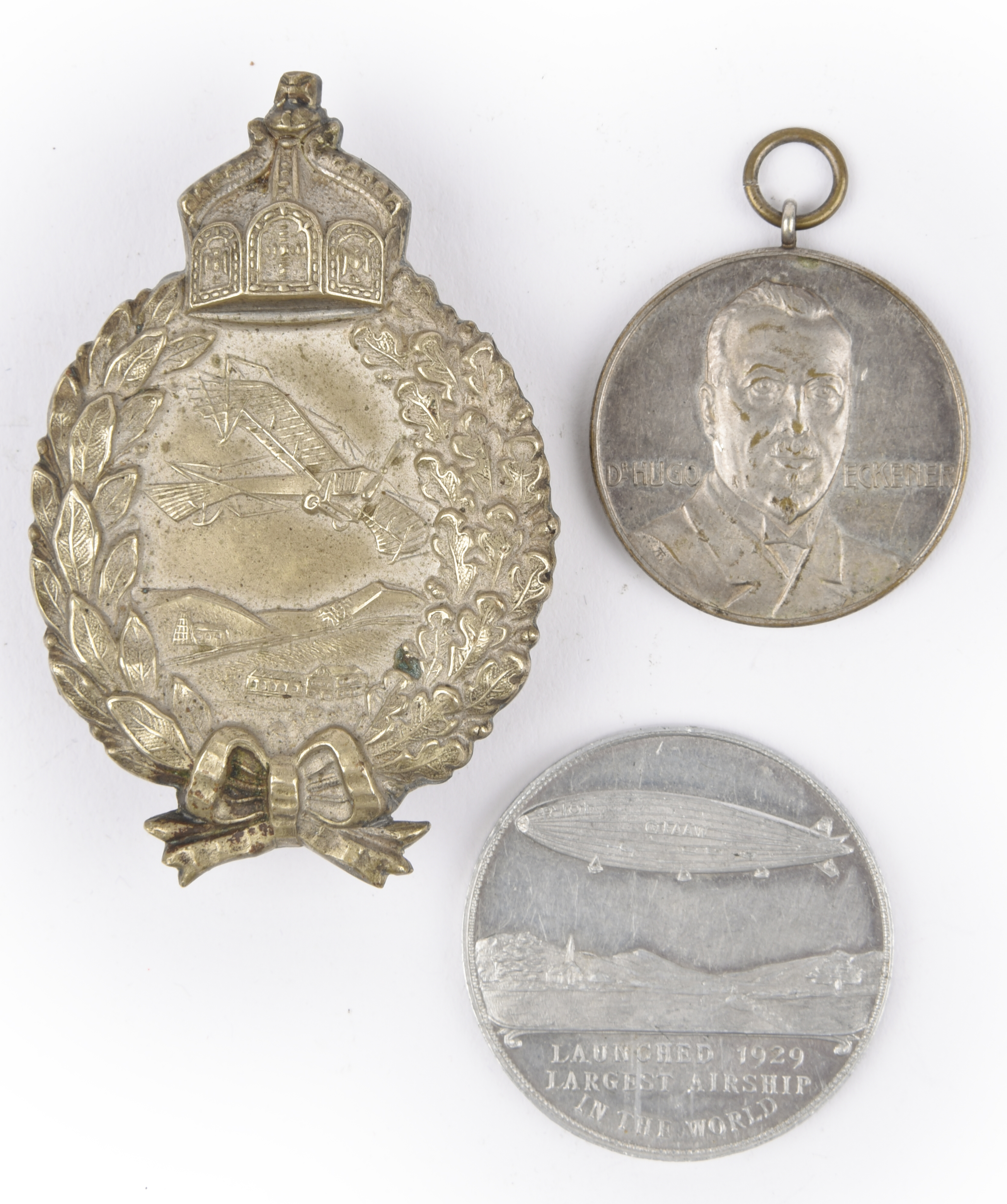 An Imperial German pilot's badge, oval form with a monoplane flying over a landscape within a wreath border below the German State Crown, vertical pin to the back; together with two white metal souvenir medals, the first commemorating Dr Hugo Eckener and the American voyage of LZ126 in 1924, good very fine, the other the launch of R101 in 1929, by Gaunt, very fine. [3]