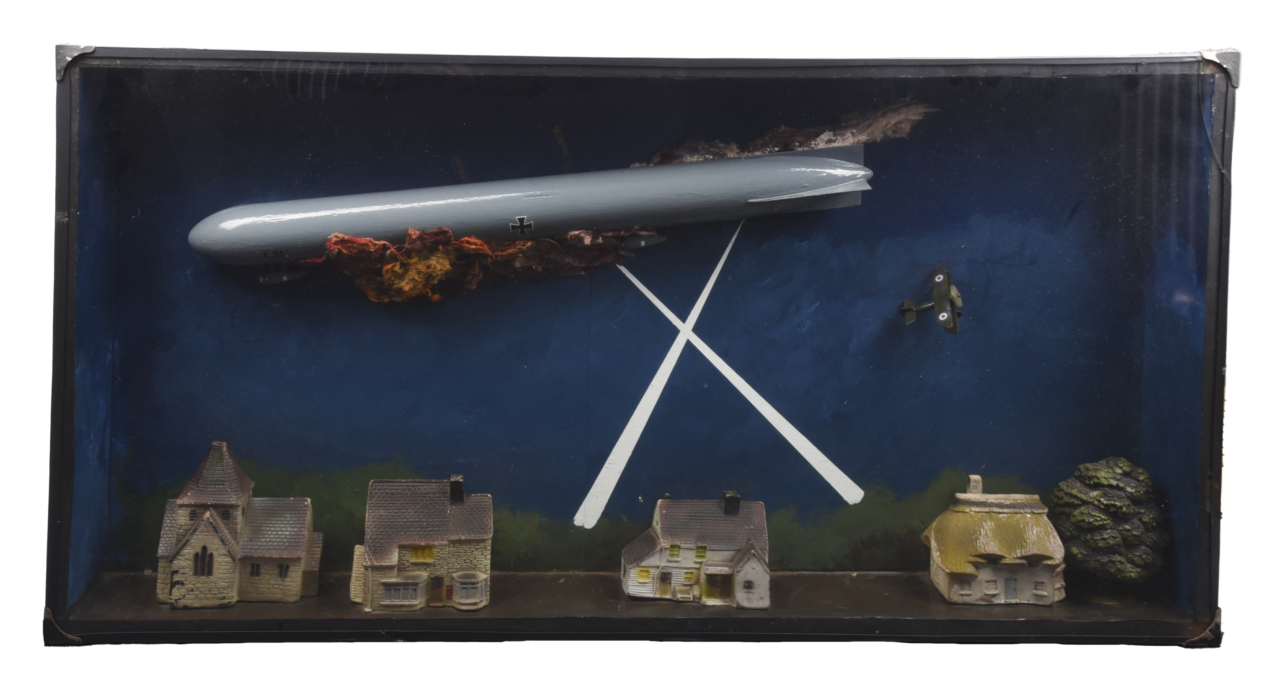A large and partially scratch built diorama depicting the shooting down of a Zeppelin by a British bi-plane, the airship marked 'L31' and with applied flames and smoke, the bi-plane climbing away to the left, a model village below and the backing board painted to represent a night sky with searchlights, all within a deep glazed frame measuring 52 x 100 cm.