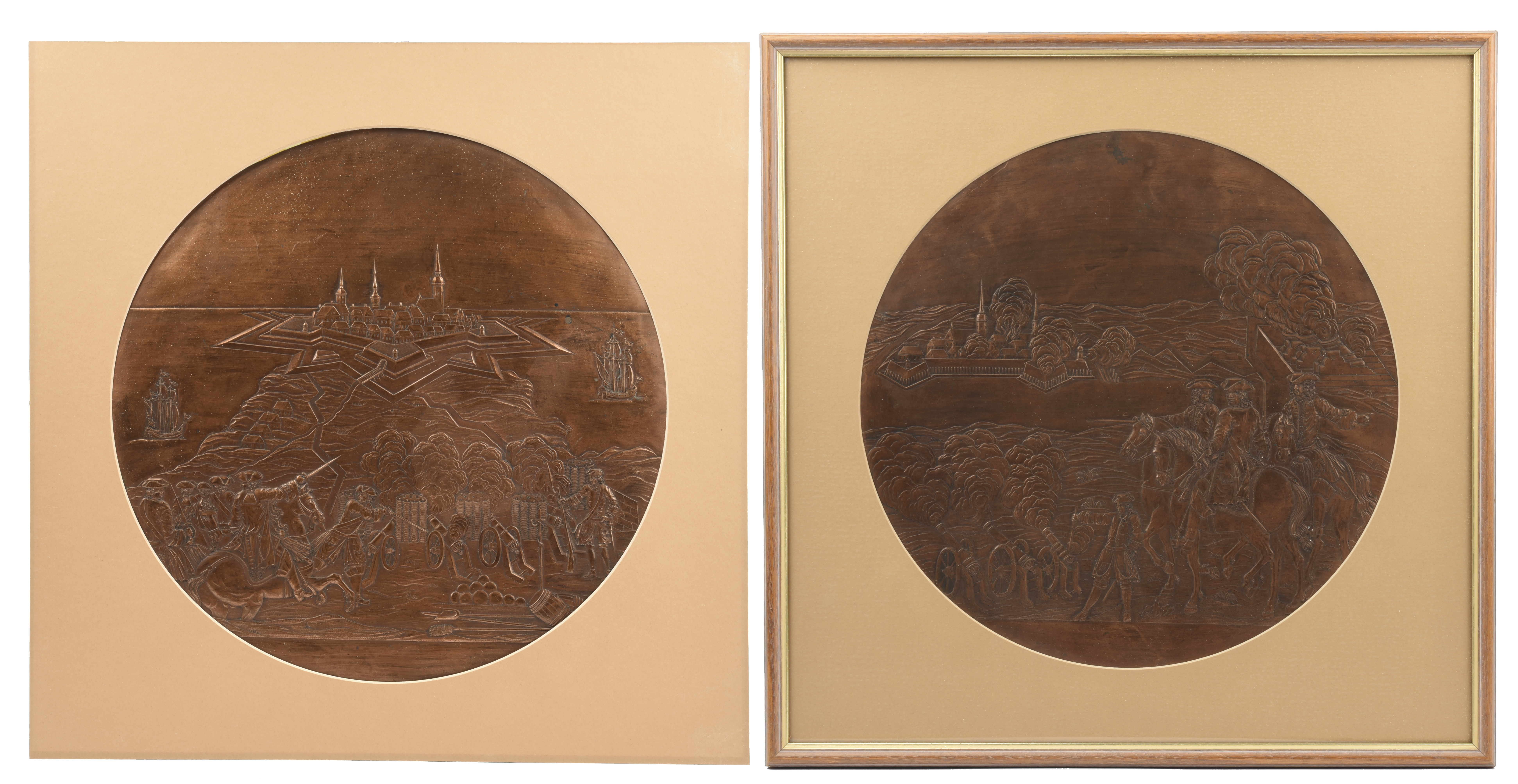 A pair of large copper electrotype reliefs depicting siege warfare of the late 17th century, each circular 360mm, one with a scene of equestrian officers directing artillery against a star fort situated on a peninsula, cannon firing between fascines, saps approaching the walls of the fortress, houses and spires within, a warship in the waters to each side; the other similar, with mounted officers and foot gunners to the foreground, mortars firing beyond them to the right and a star fort on the left; in glazed frames. [2]