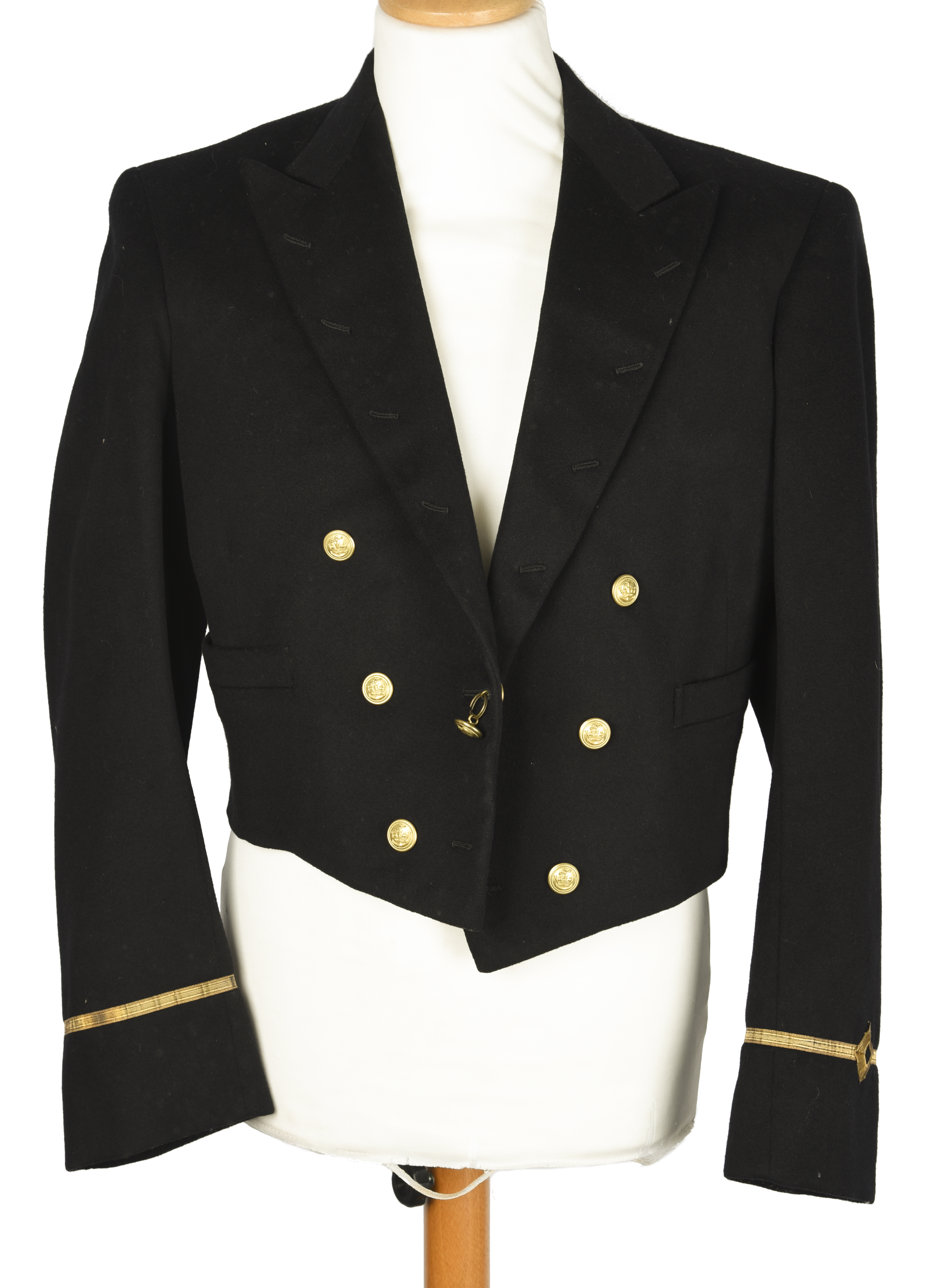 A Victorian Midshipman's dirk, the scabbard initialled 'E.W.H.B.' to the locket and with Gieves & Co badge; together with a naval mess jacket, the cuffs with a single plain band of braid. [2]